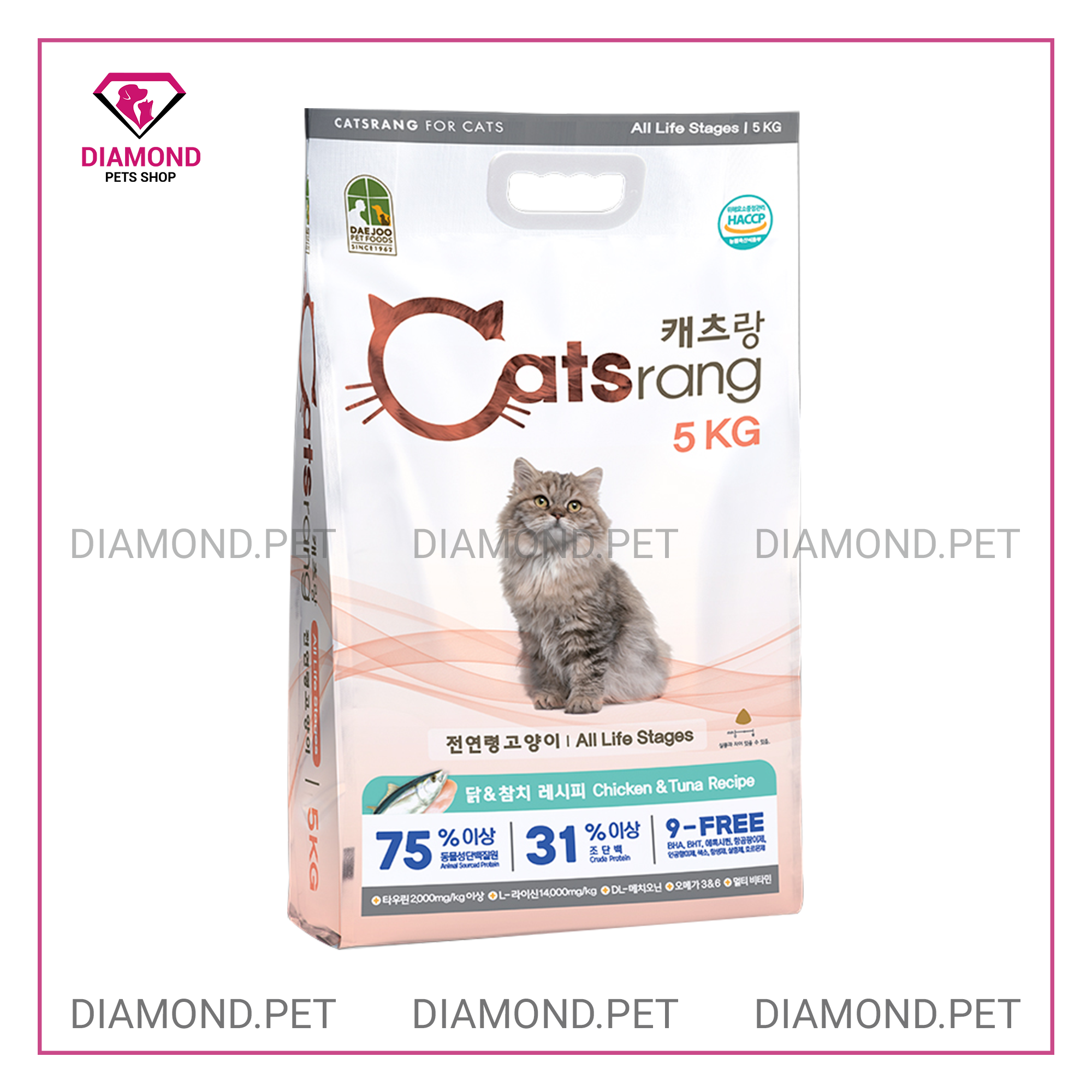 | Loại sản phẩm: Thức ăn hỗn hợp hoàn chỉnh cho mèo Tên sản phẩm: Catsrang All Life Stage Nhà sản xuất: Dea Joo Dạng sản phẩm: Dạng viên Màu sắc hạt: Màu nâu Áp dụng: Dành cho mèo trên 3 tháng tuổi Xuất xứ: Hàn Quốc Khối lượng: 5kg