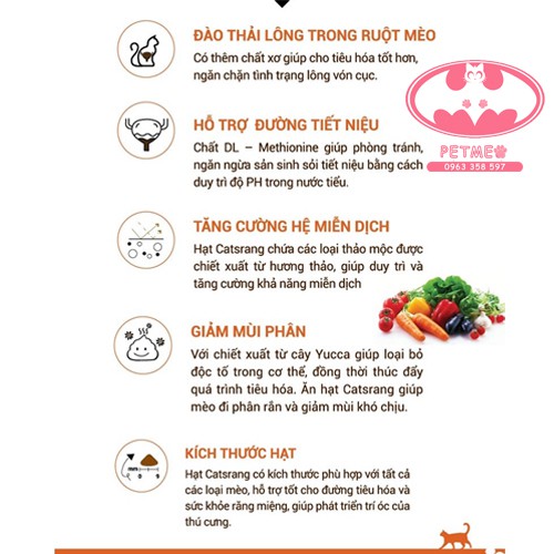 3. Dễ tiêu hóa: Thức ăn hạt cho mèo mọi lứa tuổi CATSRANG là sản phẩm dễ tiêu hóa, đảm bảo chú mèo của bạn sẽ không phải đau bụng đi ngoài nữa. Một điểm cộng khá lớn của sản phẩm là giảm mùi hôi của phân mèo. Tuyệt quá phải không?