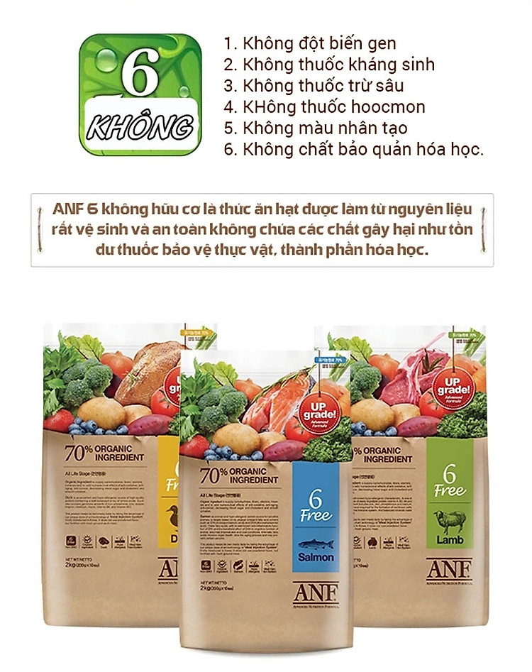 Đây là sản phẩm hạt HỮU CƠ của thương hiệu ANF ( thành phần hữu cơ lên đến 95%). Với nguyên liệu hữu cơ thiên nhiên, sản phẩm thức ăn cho chó của chúng tôi tự tin giúp cho thú cưng của bạn khỏe mạnh và đẹp đẽ mỗi ngày. Gồm có 3 vị: cá hồi, thịt cừu và thịt vịt
