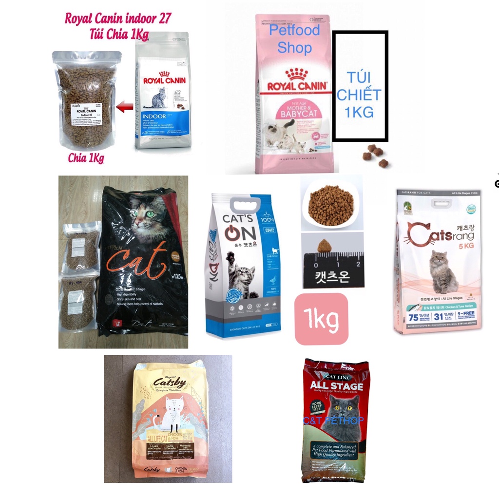Giới thiệu Thức ăn hạt khô Catsrang, cat eye, royal kitten, royal indoor cho mèo1kg túi zip