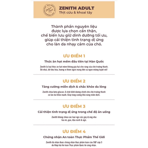 Cung cấp đa dạng các chất dinh dưỡng, đáp ứng nhu cầu cao của các chú chó trưởng thành Thức ăn hạt mềm chó trưởng thành Zenith Adult có hàm lượng dinh dưỡng, vitamin và khoáng chất cao, được thiết kế để đáp ứng được khẩu phần ăn của các chú chó trưởng thành. Dầu cá hồi chứa Omega 3 và Omega 6 tốt cho mắt và da lông. Thịt cừu và Thịt nạc gà rút xương có giàu protein và ít béo, lượng calo cao giúp phát triển cơ xương chắc khỏe; canxi trong yến mạch và canxi carbonat giúp xương và răng chắc khỏe, phòng tránh bệnh hạ bàn. Tăng cường sức đề kháng, phòng tránh bệnh tật cho chó Zenith Adult rất giàu β-glucan. Đây là một loại chất xơ thực vật, có tác dụng tăng sự ngon miệng của chó, tăng cường khả năng miễn dịch và giúp chú chó luôn khỏe mạnh. Axit béo và lecithin được bổ sung để tăng sức đề kháng tự nhiên. Ngoài ra, chondroitin và glucosamine giúp tăng cường miễn dịch, cho các khớp xương của chó thêm chắc khỏe. Tăng cường sức khỏe đường ruột, tốt cho hệ tiêu hóa của chó trưởng thành Thức ăn hạt mềm chó lớn Zenith Adult không gây dị ứng ở các chú chó do không chứa ngũ cốc như các loại đậu giá rẻ, bắp, lúa mì… Sản phẩm tốt cho hệ tiêu hóa của chó do có thành phần bột dừa, chất xơ, các vitamin và khoáng chất bổ sung, giúp ức chế sự tăng trưởng của vi sinh vật có hại cho đường ruột, chống tiêu chảy. Thành phần tươi sạch, dễ hấp thu, giảm thiểu mùi phân và mùi cơ thể Chiết xuất từ cây ngọc giá giúp giảm bớt mùi phân ở các chú chó. Lượng calo cao và ít mỡ của thịt cừu tươi rất tốt cho hệ tim mạch. Gạo lứt làm giảm cholesterol, bảo vệ hệ tim mạch, cải thiện chức năng gan, giúp cơ thể đào thải những chất độc có hại. Zenith Adult được chế biến dưới dạng hạt mềm, độ ẩm cao hơn thức ăn hạt khô thông thường, lượng muối thấp, rất dễ nhai và dễ tiêu hóa. Giúp chó trưởng thành đẹp da, mượt lông Các thành phần chứa nhiều Omega 3: dầu cá hồi, dầu thực vật, dầu dừa, dầu hạt hướng dương giúp làm đẹp da, mượt lông cho các chú chó, nhất là các giống chó có bộ lông dày, rậm như Poodle, Corgi, Golden, Husky, Labrador, Berger (becgie), Samoyed… Zenith Adult giúp duy trì làn da sạch, mềm và bộ lông mượt mà, óng ả, giảm rụng lông, hạn chế xơ rối, phục hồi hư tổn, phòng ngừa viêm nấm, nhiễm trùng, ve rận, bọ chét…