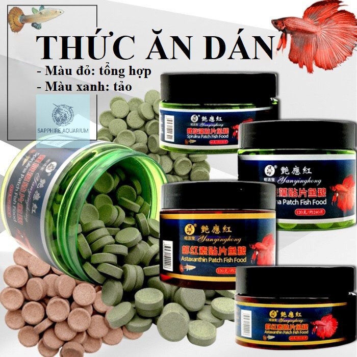 - Thức ăn dạng tổng hợp Astaxanthin Patch Fish Food và dạng tảo Spirulina Patch Fish Food là thức ăn dạng viên thực phẩm dán vào kính hồ cá có thể được quan sát thấy trong khi cho ăn, không gây đục nước.