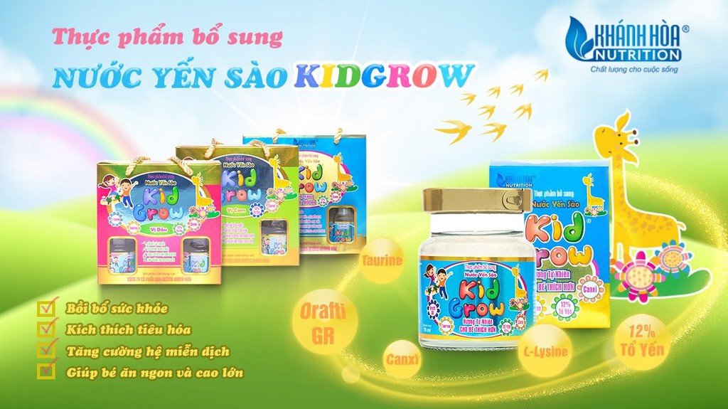 Nước Yến Sào KIDGROW dành cho trẻ em được sản xuất từ nguồn Yến Đảo thiên nhiên: Yến đảo Khánh Hòa, Yến đảo Hội An và Yến đảo Phan Thiết, kết hợp với Lysine, Taurine & Canxi nên phù hợp cho mọi đối tượng sử dụng, đặc biệt là trẻ em. Sản phẩm do Công ty cổ phần Dinh Dưỡng Khánh Hòa chế biến & sản xuất theo quy trình chưng cất Tổ yến cổ truyền và công nghệ hiện đại để bảo đảm chất lượng cao nhất cho sản phẩm