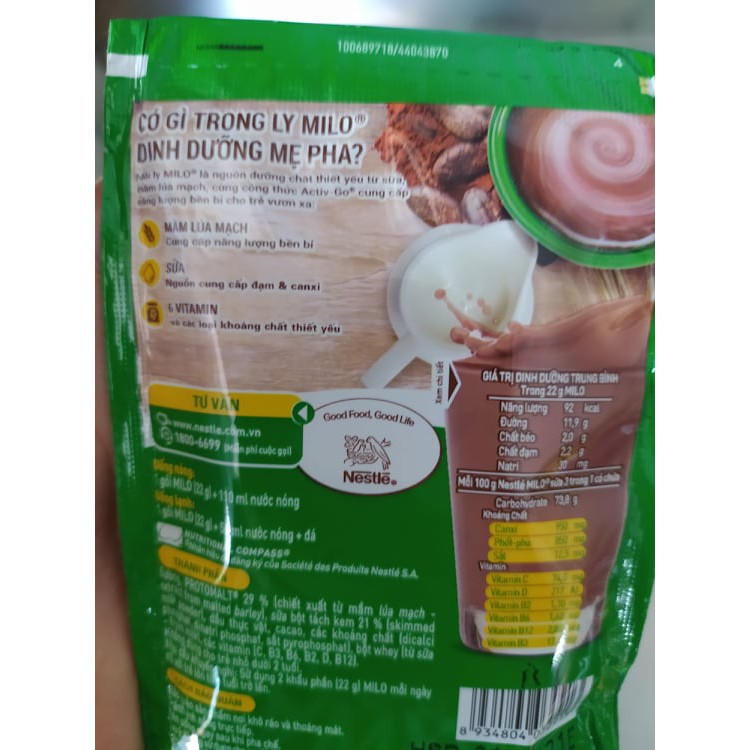 Thực phẩm bổ sung Thức uống lúa mạch Nestlé® MILO® Sữa 3 trong 1. Không dùng cho trẻ nhỏ dưới 2 tuổi. Nhu cầu khuyến nghị: Sử dụng 1 - 2 khẩu phần (22 g) MILO mỗi ngày đối với trẻ lớn từ 6 tuổi trở lên Cách bảo quản: Nên uống ngay sau khi pha chế. Tránh ánh nắng trực tiếp, bảo quản sản phẩm nơi khô ráo và thoáng mát. Không sử dụng cho người dị ứng với thành phần của sản phẩm. Cách pha chế: Công thức cơ bản: * Uống nóng: 1 gói MILO 22 g + 110 ml nước nóng * Uống lạnh: 1 gói MILO 22 g + 50 ml nước nóng + đá. Quy cách đóng gói : 1 bịch lớn 220g ( bao gồm 10 gói nhỏ bên trong , mỗi gói nhỏ là 22g )