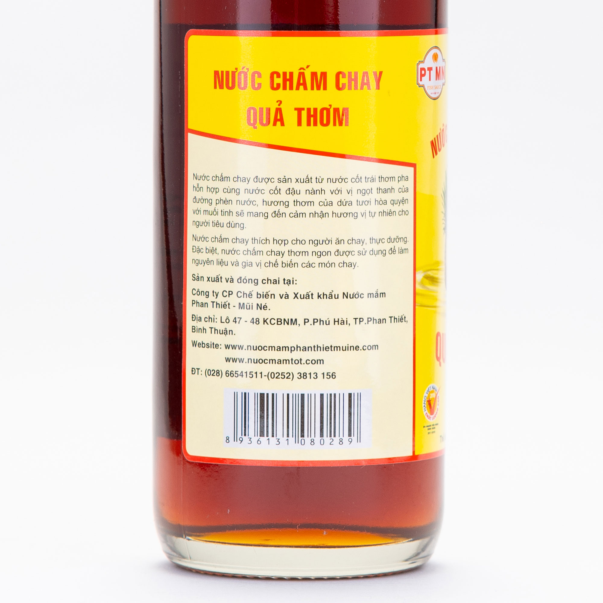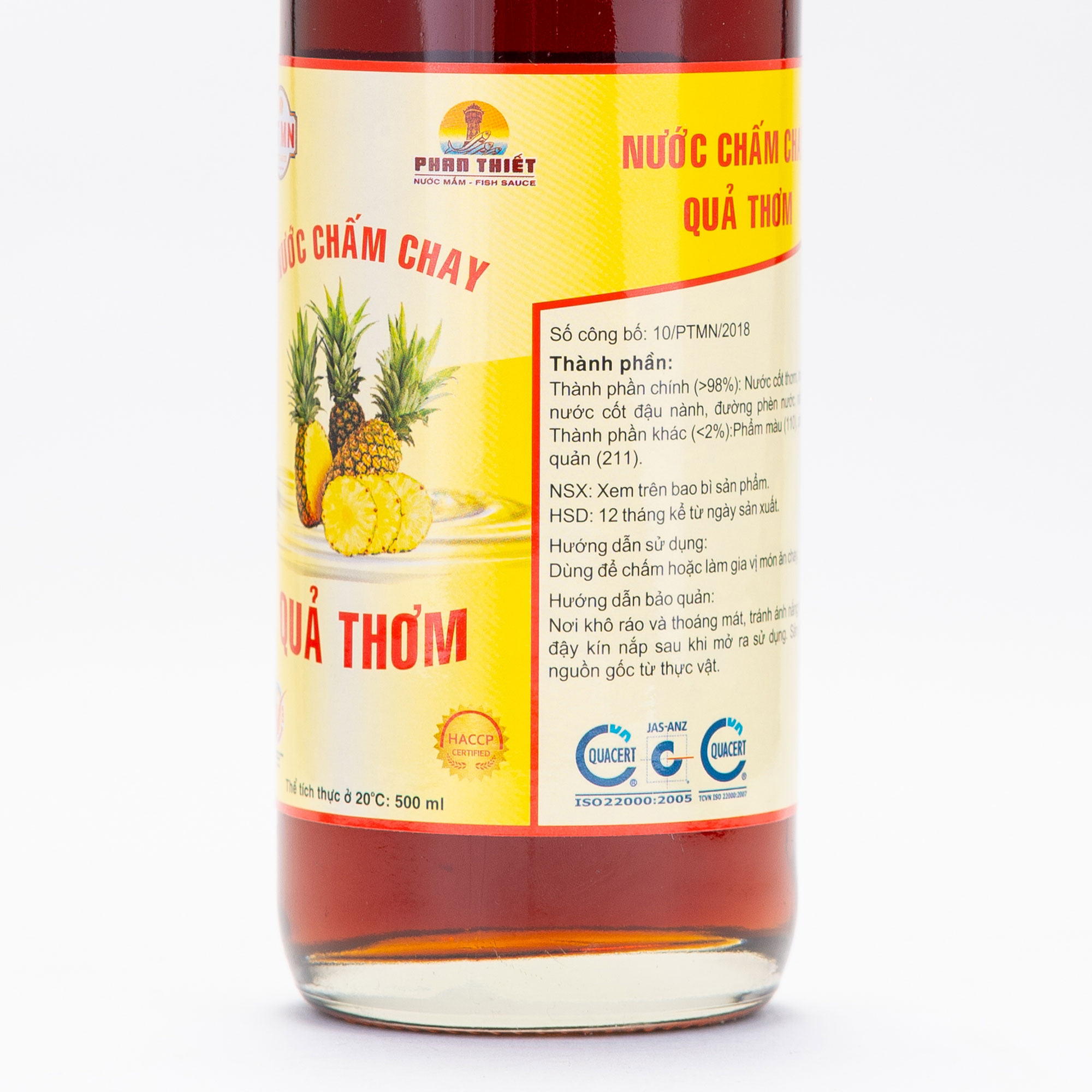 NƯỚC CHẤM CHAY QUẢ THƠM được chắt lọc từ những quả thơm tươi mát, hạt muối mặn của vùng biển Phan Thiết Mũi Né kết hợp với phương pháp lên men cổ truyền và quy trình sản xuất khép kín trên dây chuyền công nghệ tiên tiến, tạo ra dòng nước chấm chay có nguồn gốc từ thiên nhiên mang hương vị ĐẬM ĐÀ, THƠM NGON ĐẾN TỪNG GIỌT. Ngoài ra, nước chấm chay Quả Thơm – Phan Thiết Mũi Né được Bộ Y Tế công nhận đạt chuẩn quốc tế HACCP, đảm bảo sức khỏe cho người tiêu dùng.