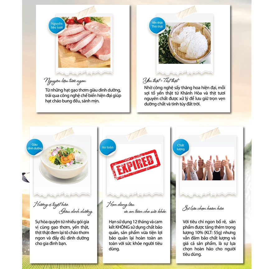 Thành phần | Phôi cháo: Gạo (80%).Gói thịt bằm sấy khô (6%): Thịt heo sấy (4%), thịt gà sấy (2%).Gói Yến và nấm tuyết: Tổ yến (1%), nấm tuyết.Gói bào ngư: Bào ngư sấy (2%).Gói dầu: Dầu cọ tinh luyện, hương thịt heo tổng hợp.Gói súp: Rong biển (1%), muối I-ốt, đường, bột thịt heo, chiết xuất nấm men, bột hành, bột tỏi, bột tiêu, bột nước tương. |