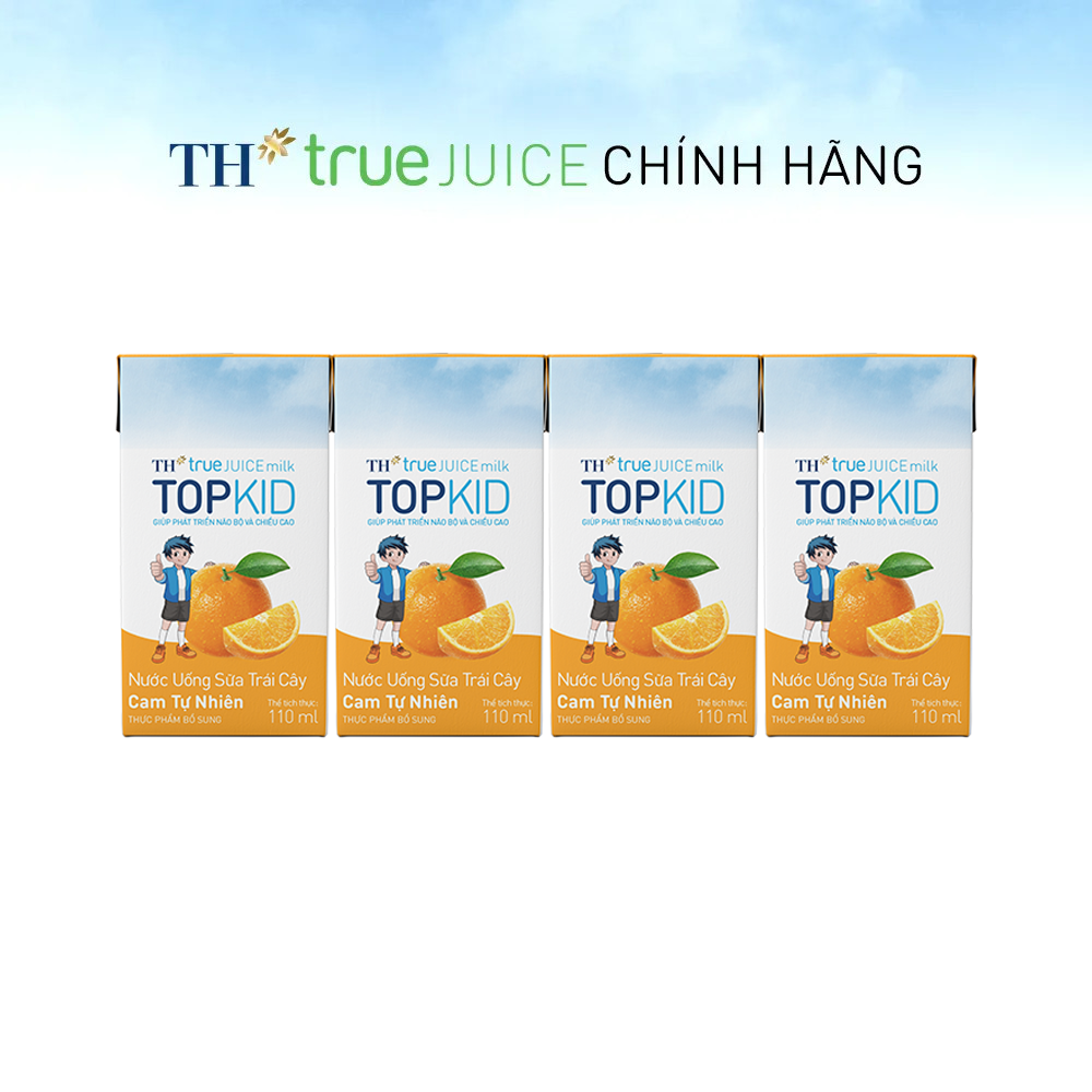 Nước uống sữa trái cây TH true JUICE milk TOPKID Cam tự nhiên là sự kết hợp giữa sữa tươi sạch của trang trại TH cùng với trái cây tự nhiên được chọn lọc kỹ càng, giúp cung cấp vitamin và khoáng chất cần thiết cho cơ thể. Ngoài ra sản phẩm được bổ sung Vitamin nhóm B (B6, B12) và Acid Folic trong công thức TOPKID giúp hỗ trợ sự phát triển não bộ và chiều cao của trẻ.