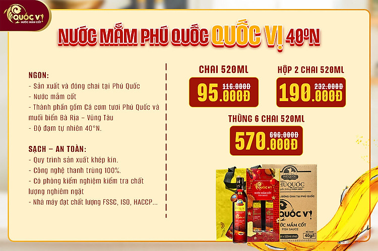 1. Với tâm huyết giữ gìn và phát triển nghề nước mắm hơn 200 năm của đảo ngọc, Quốc Vị luôn tuân thủ quy trình sản xuất hoàn toàn tự nhiên như truyền thống, chỉ tăng giá trị của sản phẩm bởi các phương pháp giám sát chất lượng và đóng gói thành phẩm hiện đại để đảm bảo an toàn vệ sinh thực phẩm. Do đó, Quốc Vị tự tin những sản phẩm của mình xứng đáng là một trong những đại diện của nước mắm truyền thống Phú Quốc chân chính.