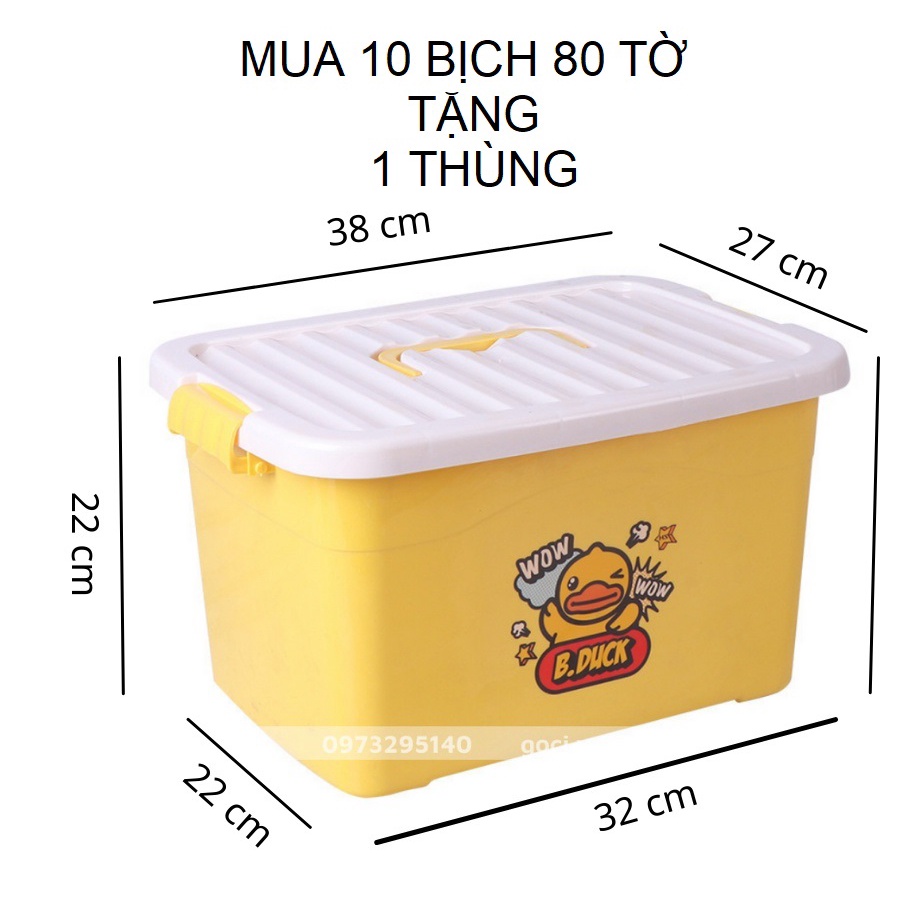 THÙNG KHĂN GIẤY ƯỚT CON VỊT VÀNG HOTTREND 🎁𝑻𝑨̣̆𝑵𝑮 𝑻𝑯𝑼̀𝑵𝑮 𝑪𝑨𝑶 𝑪𝑨̂́𝑷🎁 Combo 10 gói khăn giấy ướt vịt vàng cao cấp 80 TỜ 👍👍👍ƯU ĐIỂM CỦA KHĂN ƯỚT VỊT VÀNG: - Chất liệu tự nhiên, không chứa côfn, không mùi, không gây nhờn, rít da bé. - Giảm hăm và chống viêm hiệu quả. - Dưỡng da với tính năng giữ ẩm ưu việt. - Chất giấy vải không dệt mềm mịn không làm trầy xước da bé. - Kích thước tờ khăn lớn và dày giúp thấp hút tốt. ✅✅✅ Thông tin sản phẩm: - Sản phẩm gồm: 1 thùng nhựa + 10 bịch giấy ướt mỗi bịch 80 tờ - Thùng nhựa xịn xò, dày dặn, có quai xách và nắp siêu xinh - Làm sạch bụi, vết bẩn, giấy ướt mềm mại và mịn màng, tạo cảm giác mát lạnh, thoải mái và tự tin. Sử dụng lau tay khi đi xa, trước khi ăn và sau khi rửa tay. - Khăn ướt Có thể sử dụng để lau mặt vì trong khăn ướt có chứa thành phần chất diệt khuẩn, làm giảm mụn một cách nhanh chóng, cho da mặt sạch sẽ, mịn màng và ngăn vi khuẩn bám trên bề mặt da. - Sản phẩm giấy ướt không chứa cồn và không gây mẫn cảm với làn da mà lại tạo cảm giác mát lạnh, thoải mái và tự tin.
