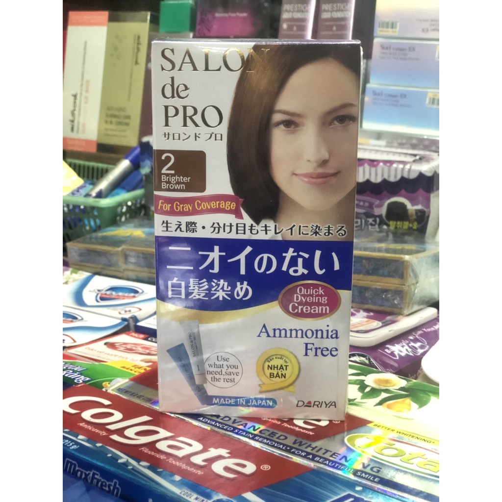 Thuốc nhuộm tóc Salon De Pro chuyên dùng cho tóc bạc. Sản phẩm không chỉ không có mùi khó chịu như những loại thuốc nhuộm khác mà còn có chất kết dính thấm sâu vào tóc hiệu quả nhanh chóng, màu lên tự nhiên, lâu phai. Sản phẩm gồm 4 thành phần chiết xuất tự nhiên giúp tăng cường dưỡng ẩm, cho tóc mềm mại, không khô rối. Dầu hoa trà giúp dưỡng tóc bóng mượt, hợp chất Protein tơ tằm giúp tóc dày và chắc khỏe, Protein thực vật bảo vệ tóc bởi các yếu tố bên ngoài, chiết xuất sữa ong chúa giúp dưỡng ẩm, cho tóc không bị xơ rối. Sản phẩm có thể dùng cho cả tóc đen bình thường.