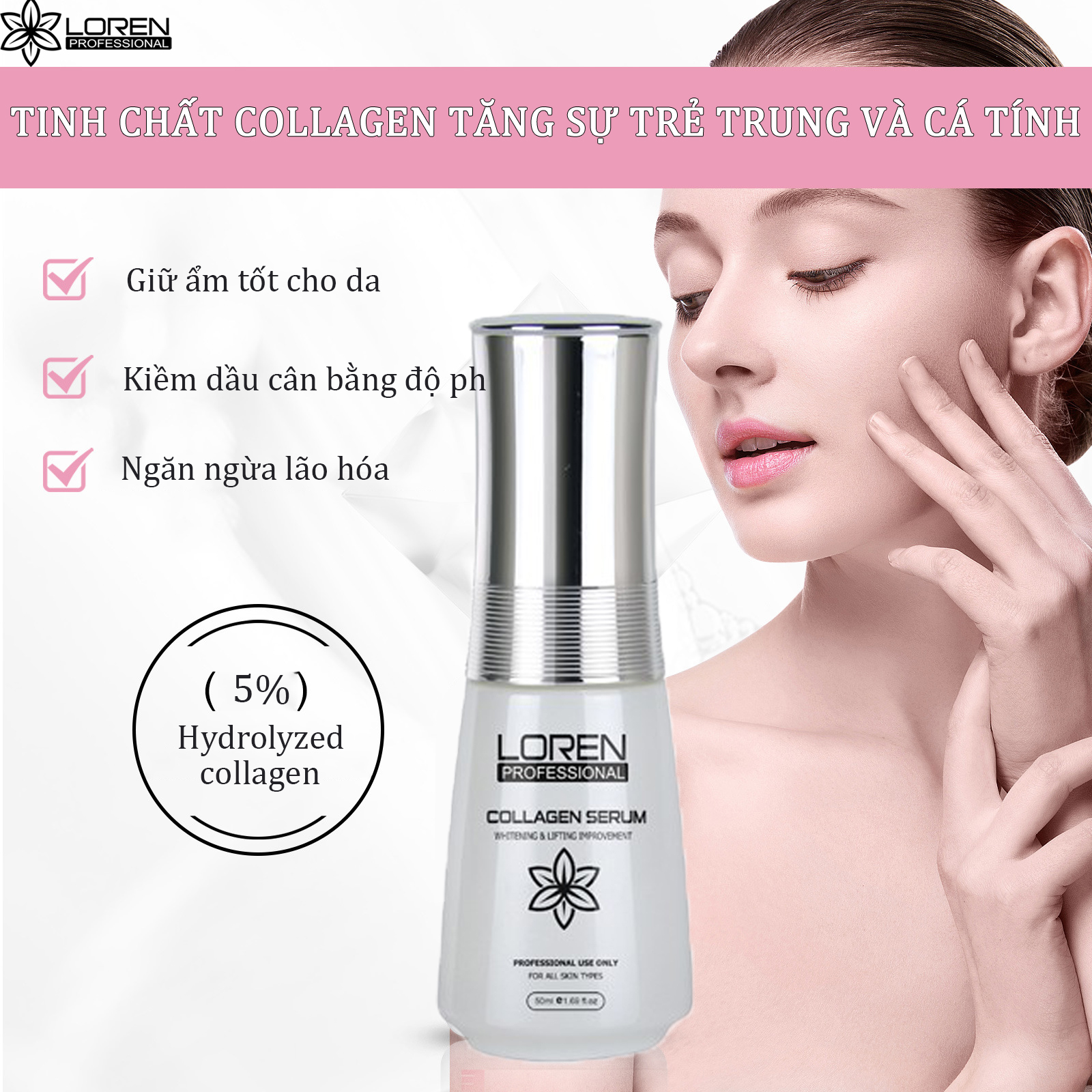 – Collagen ( Hydrolyzed collagen 5%) cung cấp hoạt chất collagen tinh khiết cho da, giúp trẻ hóa da, mang lại cho bạn làn da tươi trẻ và tràn đầy sức sống. Sản phẩm dạng lỏng, kết cấu từ phân tử siêu vi, dễ dàng thẩm thấu qua da.
