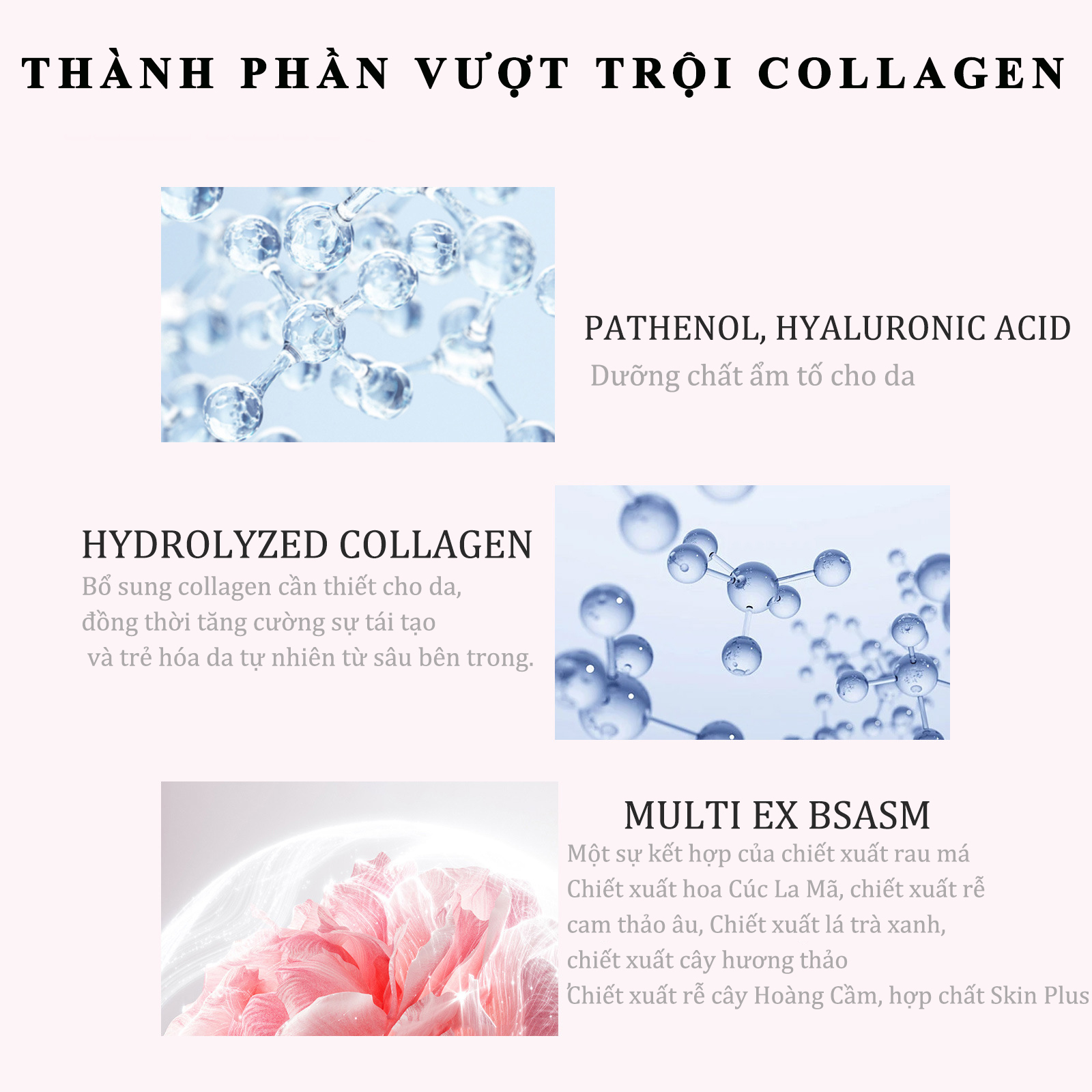 – Sản phẩm Chứa collagen giúp tái tạo da, đẩy nhanh quá trình làm liền sẹo lõm, giảm thiểu tình trạng da chảy sệ hay lão hóa. Chứa hồng hoa, giúp se lỗ chân lông, kiềm dầu và cân bằng độ PH.
