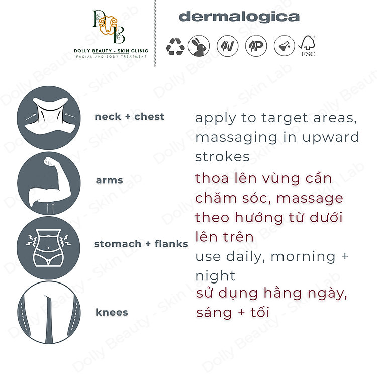 Thoa lên vùng da cần điều trị, Massage theo hướng từ dưới lên trên. Sử dụng hai lần mỗi ngày, sáng và tối.