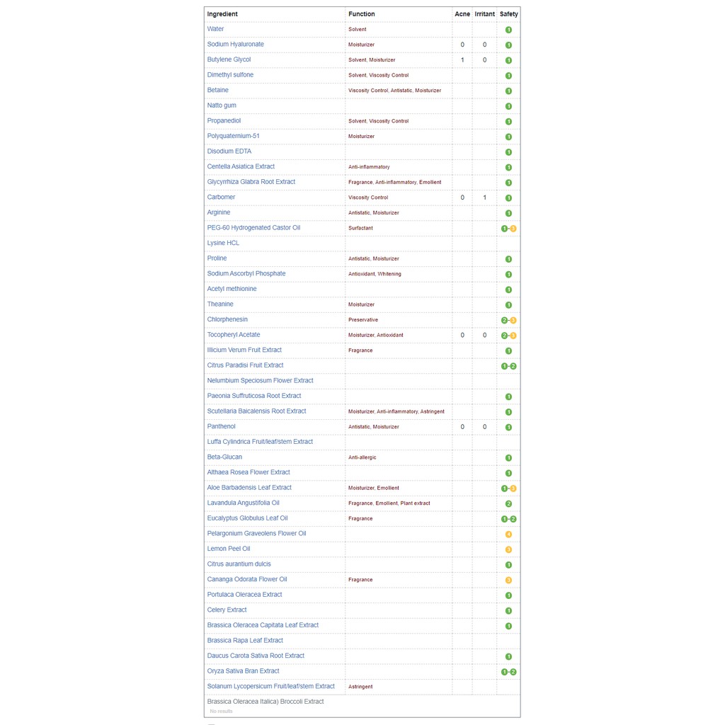 Thành phần: - Các thành phần nổi trội như: Sodium Hyaluronate, Dimethyl Sulfone, Betaine, Natto Gum, - Ngoài ra còn có chiết xuất rau má và Sodium Ascorbyl Phosphate