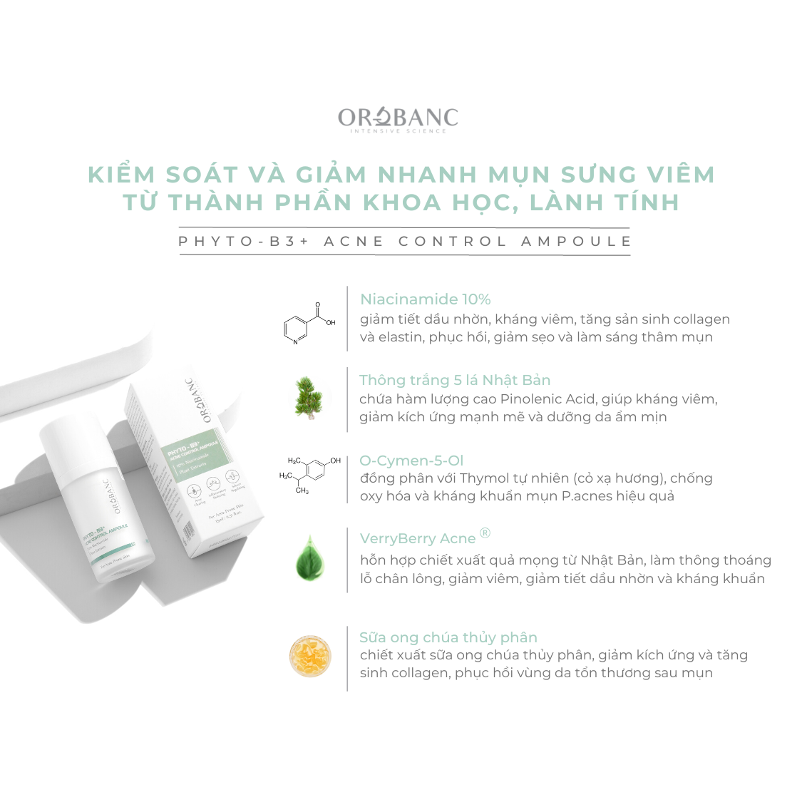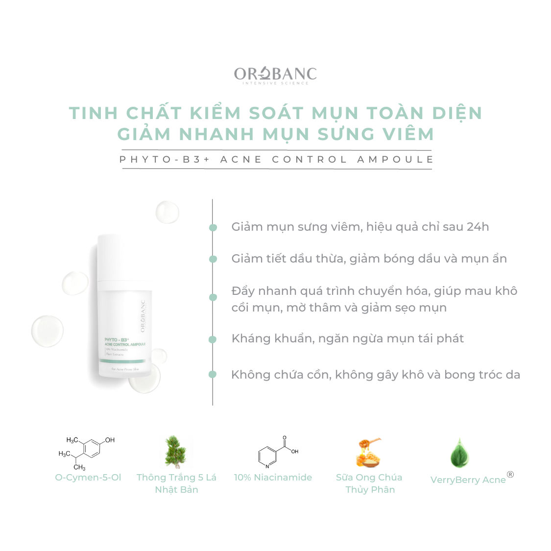Phyto-B3+ Acne Control Ampoule với công thức khoa học chuyên sâu, kết hợp 10% Niacinamide và các chiết xuất thực vật, giúp cải thiện hiệu quả tình trạng mụn sưng viêm, nhanh khô cồi mụn, giảm mụn ẩn, mờ thâm, giảm sẹo mụn và ngăn ngừa mụn tái phát.