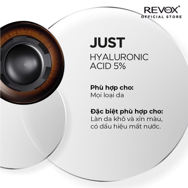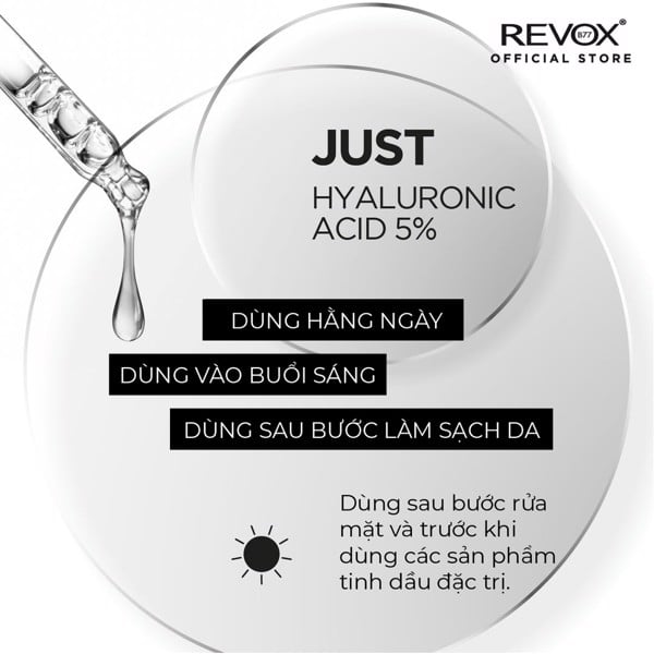 Tinh chất dưỡng ẩm cho mặt và cổ Revox B77 Just - Hyaluronic Acid 5% giúp ngăn ngừa sự mất độ ẩm và giữ lại độ ẩm cho da, giúp da trông căng mọng suốt cả ngày, đem lại làn da trông tươi sáng và mịn màng hơn.
