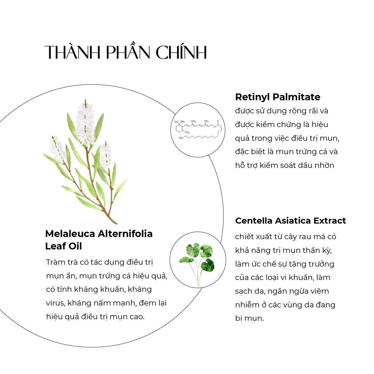 - Melaleuca Alternifolia Leaf Oil: tràm trà có tác dụng giảm mụn ẩn, mụn trứng cá hiệu quả, bởi thành phần của nó có chứa hydrocacbon terpene, monoterpenes và sesquiterpenes cùng hàm lượng Terpinen-4-ol cao. Đây là các hợp chất có tính kháng khuẩn, kháng virus, kháng nấm mạnh, đem lại hiệu quả giảm mụn cao.
