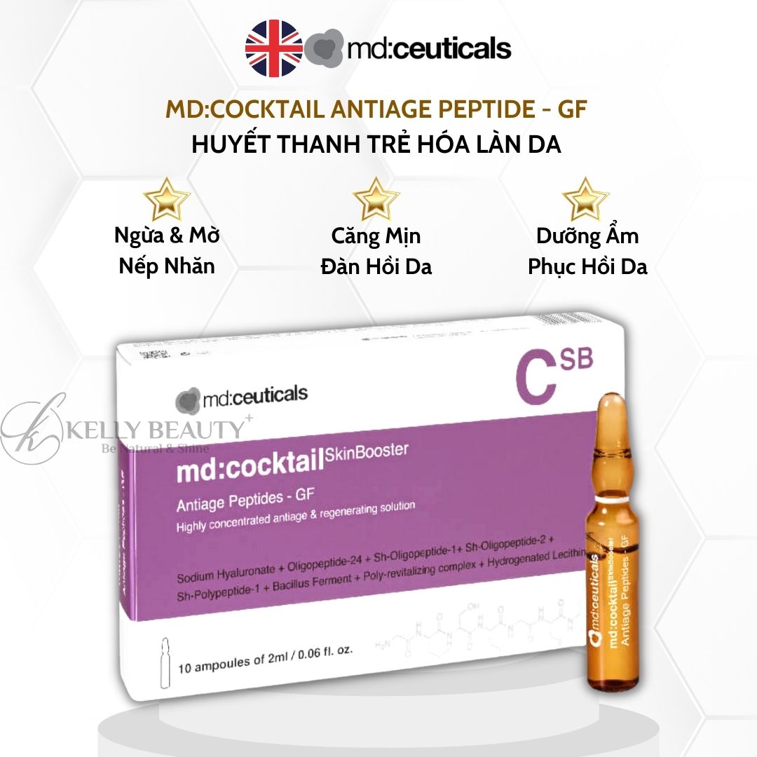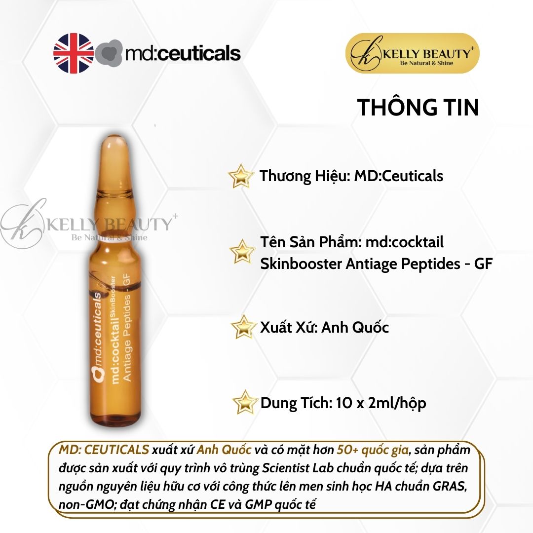 Tinh Chất Trẻ Hóa Da MD:Cocktail SkinBooster AntiAge Peptides - GF | md:ceuticals - kết hợp nồng độ cao Peptide phỏng sinh học và Yếu tố tăng trưởng với các thành phần phục hồi, tái tạo, chống oxy hóa và chống lão hóa mạnh mẽ nhất. Có tác dụng ngay lập tức trên da, giúp cải thiện đáng kể sức khỏe và vẻ đẹp của làn da, giảm thiểu sự xuất hiện của các đường nhăn, nếp nhăn, tăng sắc tố và da sần sùi.