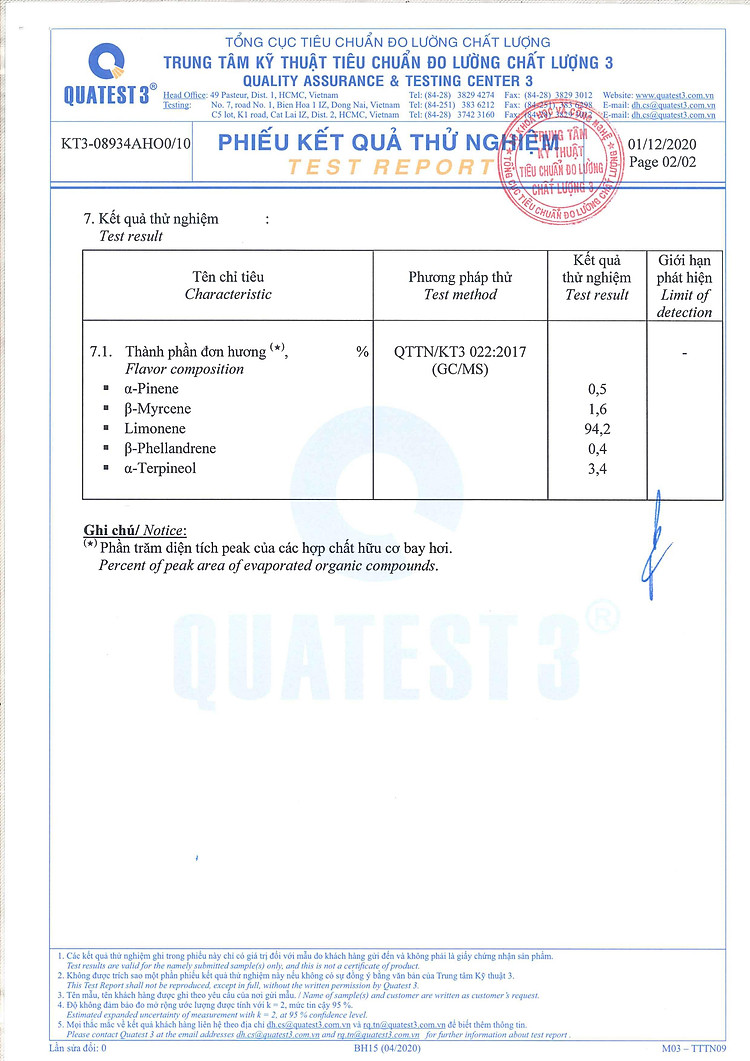 | Hướng dẫn bảo quản | Đậy kín khi không sử dụng, nhiệt độ cao tinh dầu bay hơi nhanh |