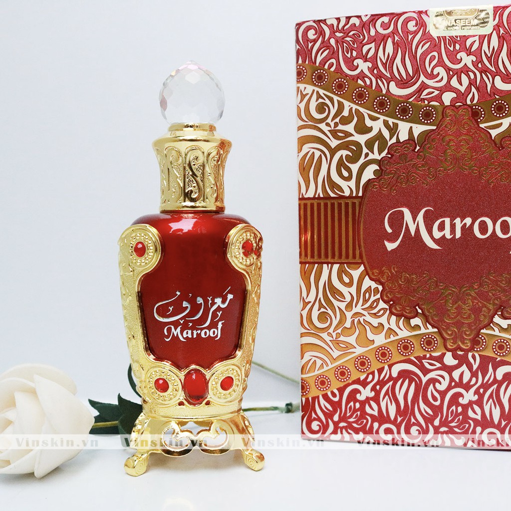 Cảm nhận: Maroof mang đậm phong cách nhã nhặn, lịch lãm và quý phái của người phụ nữ Ả Rập. Maroof ngửi rất đặc trưng, đầy vui thú, và “quan trọng là thần thái” Hương đặc trưng: Hương hoa hồng ả rập ấm áp, lãng mạn Phong cách: đặc trưng, cổ điển, có một chút nét hiện đại con người Dubai lịch lãm và sang trọng, nhưng không kém phần quyến rũ và lãng mạn Nhóm hương: hoa hồng Ả Rập, gỗ đàn hương, xạ hương và trái cây thanh mát