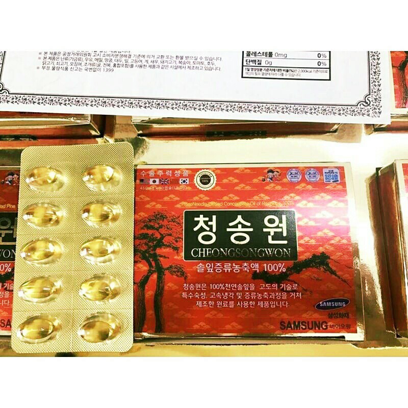CAM KẾT - Hàng Chính Hãng, Giá Cạnh Tranh Nhất - Hoàn Tiền 100% Nếu SP Ko Đúng Mô Tả ----------------------------------------------------------------- Tinh Dầu Thông Đỏ Cheongsongwon Hàn Quốc Xuất xứ : Korea Hàn Quốc Quy cách : Hộp 18 vỉ x 10 viên