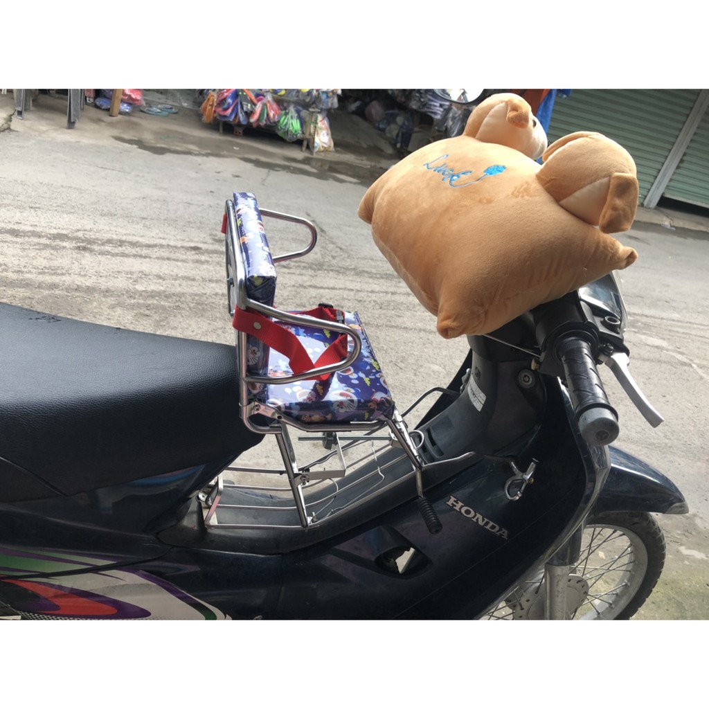 Tên sản phẩm : Ghế Ngồi Xe Máy Cho Bé, Ghế Dùng Cho Xe Số Có Dựa Lưng GHẾ DÙNG CHO CÁC DÒNG XE : XE DREAM, XE WAVE, XE FUTURE, XE SIRUS, XE AIRBLACK, XE EXCITER, XE WIN - Kích thước: 32cm x 32cm x 22cm (dài x rộng x cao) - Khối lượng: 1.5 kg - Chất liệu: Khung sườn: Inox, Nệm ghế: mút, vải - Độ tuổi: cho bé từ 1 tuổi trở lên. - Nơi sản xuất: Việt Nam - Được thiết kế bằng khung sườn Inox cứng cáp, chống rỉ, chắc chắn và độ cao phù hợp đảm bảo an toàn cho bé khi đi xe. - Ghế có dựa lưng cho bé cảm giác thoải mái và thích thú hơn khi đi xe. - Nệm ghế bằng mút bọc vải mềm mại cho bé cảm giác thoải mái và an toàn khi ngồi trên xe gắn máy dạo phố . - Ghế có đai an toàn, giữ bé vào ghế, chắc chắn, dễ dàng sử dụng. - Hình trên mặt đệm đa dạng mẫu mã, màu sắc, dễ thương sẽ làm bé thích thú. - Trọng lượng cho phép tối đa 20kg - Có thể tháo ra, lắp vào,gập ghế dễ dàng khi cần thiết. - Bạn nên mua thêm dây đai an toàn và gối đi xe cho bé, nón bảo hiểm cho bé. Để chuyến đi đảm bảo an toàn tới mức có thể #ghexemay #ghexemaychobe #ghedixemay #daixemaychobe #ghế_đi_xe_máy #ghế_đi_xe_máy_cho_bé #ghế_đi_xe_máy_cho_bé_lớn #ghế_ngồi_xe_máy