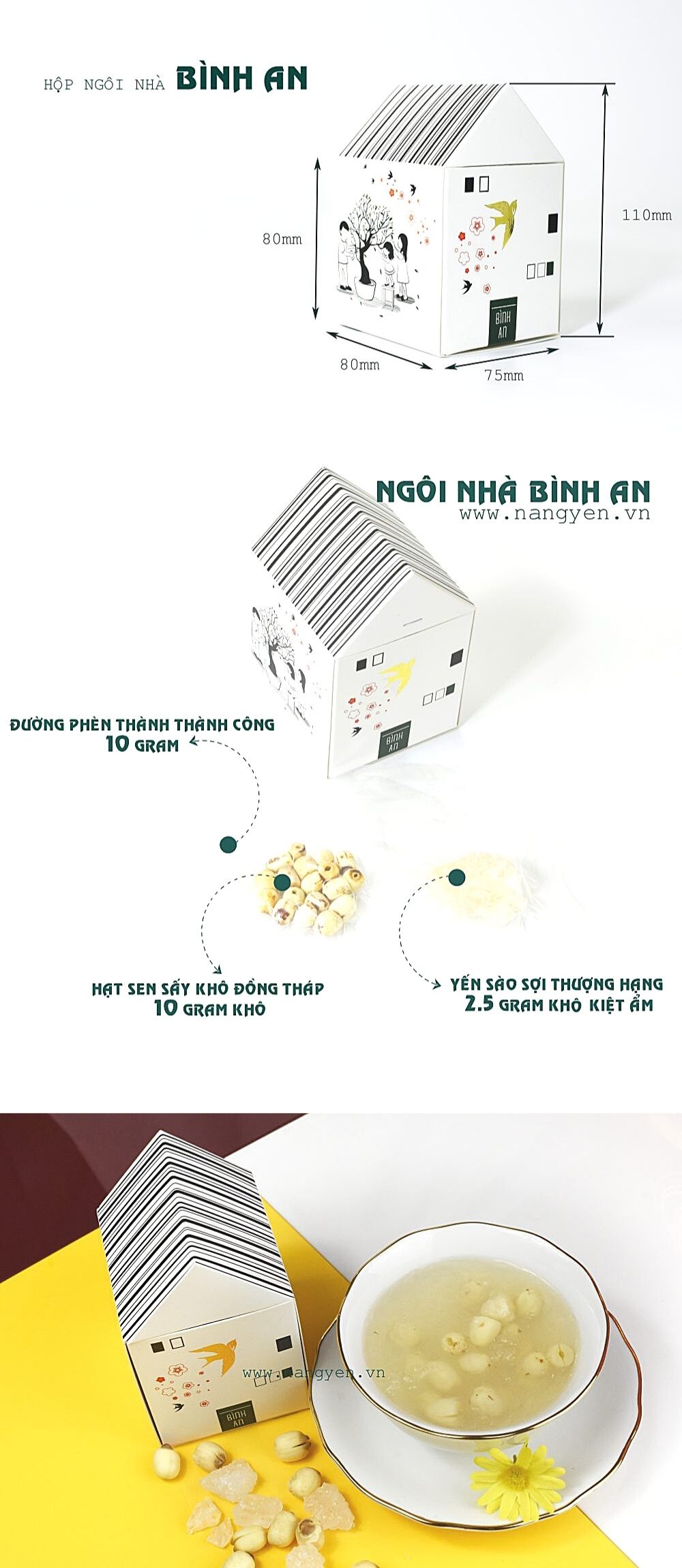 Quy cách đóng gói | Hộp ngôi nhà YÊU THƯƠNGHộp ngôi nhà SẺ CHIAHộp ngôi nhà BÌNH ANĐược đặt trong túi giấy có dán logo Nàng Yến |
