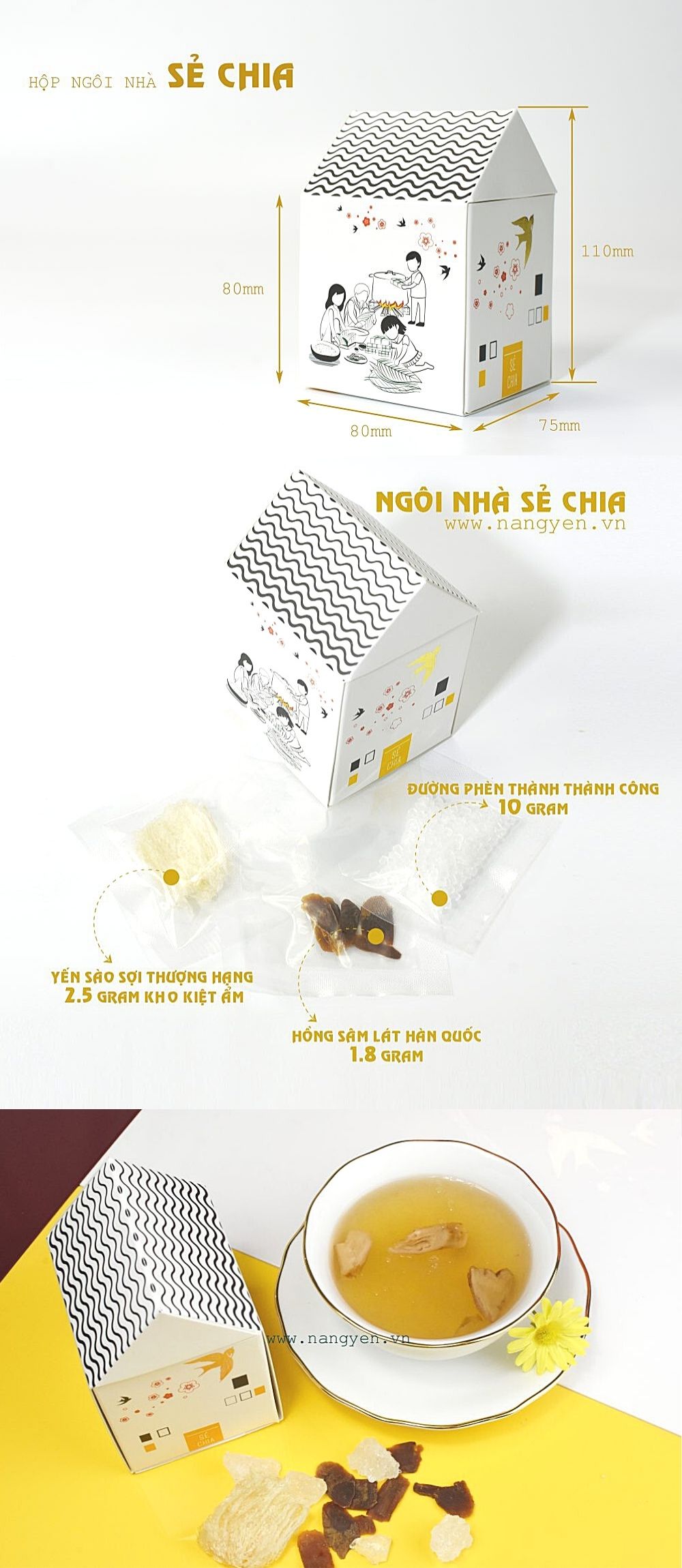 Thành phần | Hộp ngôi nhà YÊU THƯƠNG- 2.5 gram yến tinh chế sợi vuông cao cấp-19 gram Táo Đỏ Hàn Quốc- 10 Gram đường phèn TTCHộp ngôi nhà SẺ CHIA- 2.5 gram yến tinh chế sợi vuông cao cấp-1.8 gram Nhân Sâm lát Hàng Quốc- 10 Gram đường phèn TTCHộp ngôi nhà BÌNH AN- 2.5 gram yến tinh chế sợi vuông cao cấp- 10 gram Hạt Sen Đồng Tháp- 10 Gram đường phèn TTC |