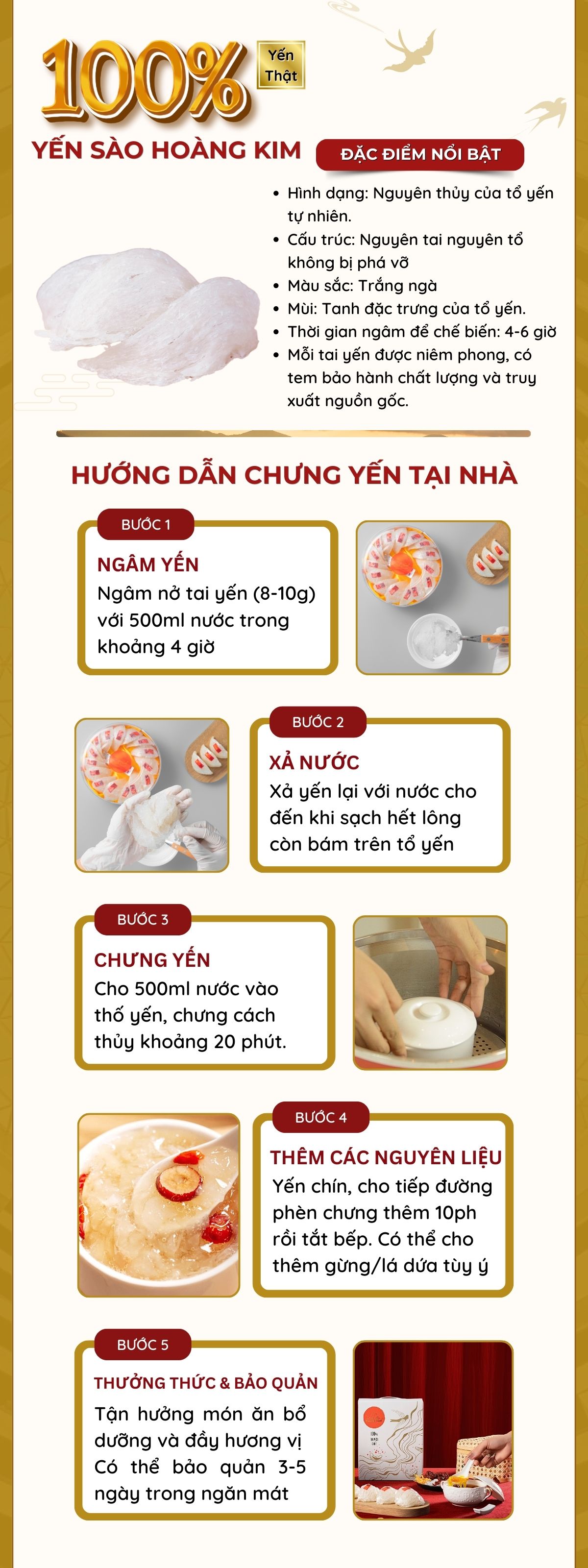 Hướng dẫn sử dụng | B1: Ngâm nở tai yến ( khoảng 8-10g) trong 4 giờ. Cho tổ yến vào rây rồi xả dưới vòi nước cho sạch tạp chất và lông tơ.B2: Cho yến sau rửa sạch vào thố chưng cùng 350-400ml nước. Thời gian chưng cách thủy khoảng 20’ để yến nở đều.B3: Cho tiếp đường phèn, chưng thêm 10’ rồi tắt bếp.Bạn có thể cho thêm lá dứa hoặc gừng tươi vào để tăng thêm hương vị tùy thích |