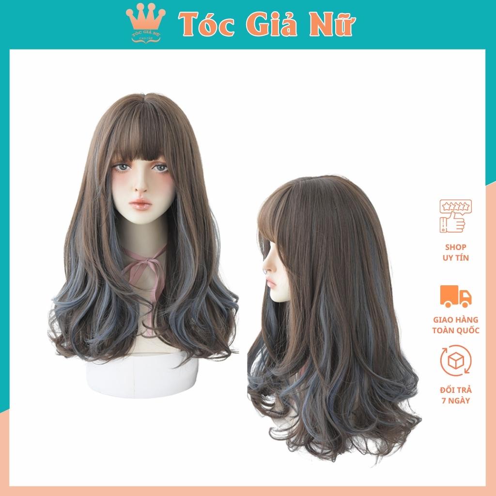 Giới thiệu Tóc giả nữ nguyên đầu xoăn nhẹ phối line xanh dương, mẫu lửng 45cm, tặng lưới wig, TGN, C8267