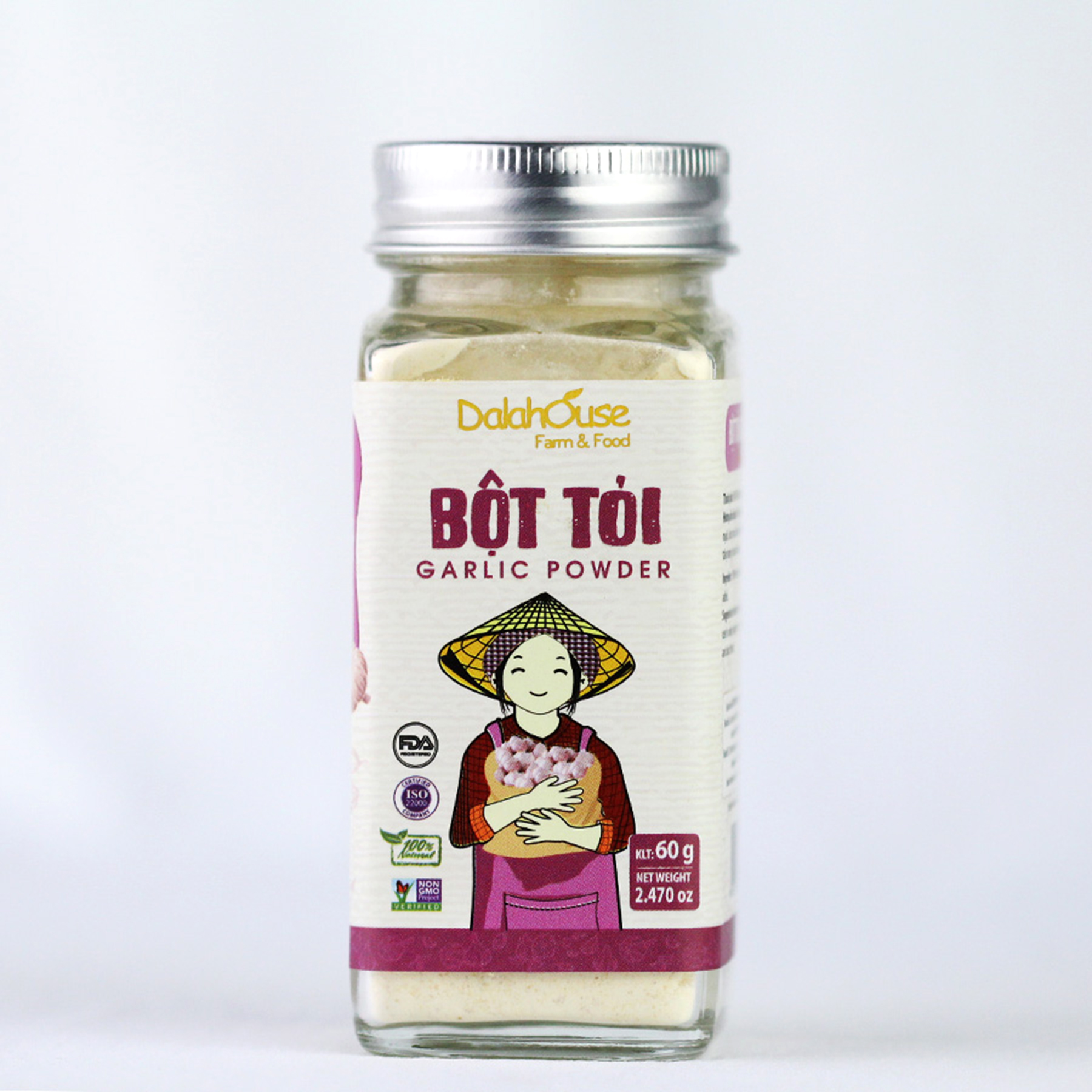 Bột Tỏi Dalahouse nguyên chất 100% Tỏi tươi được trồng và thu hoạch tại nông trại hữu cơ Dalahouse. Chúng tôi sử dụng công nghệ Sấy Lạnh hiện đại và công nghệ nghiền thực phẩm ở nhiệt độ thấp giúp bảo toàn hương vị và dưỡng chất tự nhiên trong tỏi. Bột Tỏi ấm, khô và có vị hăng.