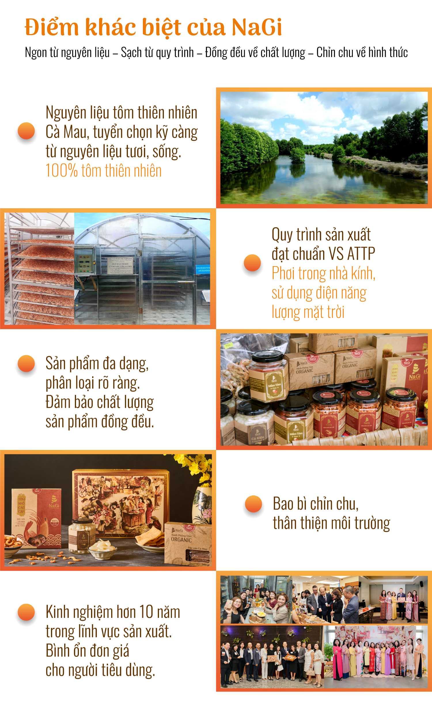 Sản phẩm tôm đất sông phơi khô của NaGi được làm từ những chú tôm đất Cà Mau còn sống, có vị ngọt tự nhiên, dai mềm, không có mùi tanh khó chịu và có màu cam đậm bắt mắt. Sản phẩm được bảo đảm quy trình chế biến nghiêm ngặt, an toàn vệ sinh thực phẩm, đảm bảo các dưỡng chất tự nhiên trong tôm đất đều được bảo toàn.