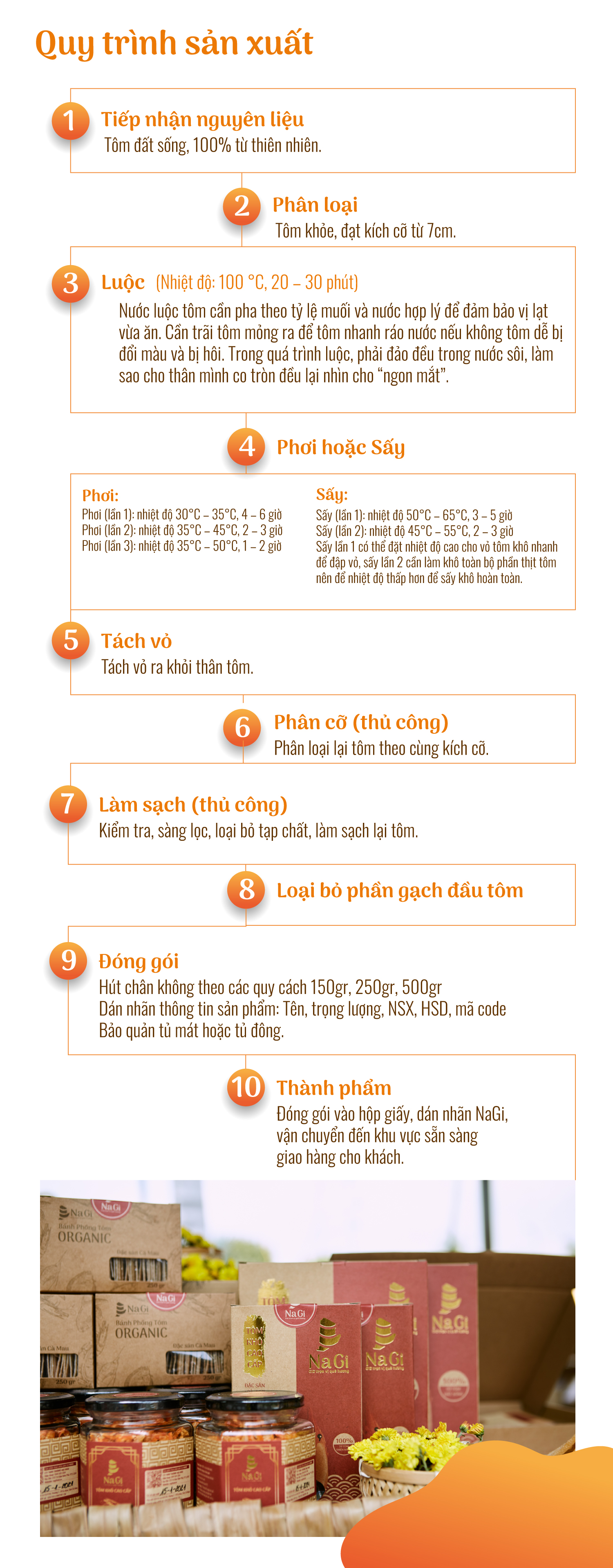 Những chú tôm đất được chọn lựa kỹ càng ngay từ khi thu hoạch. Chỉ những chú tôm sống khoẻ mạnh mới được đưa vào quy trình chế biến thành tôm khô. Những con tôm đất sống chỉ lớn bằng ngón tay người trưởng thành là một thách thức không nhỏ cho người chế biến khi phải đảm bảo làm sạch đầu, vỏ và chân để có được chú tôm khô trơn bóng theo tiêu chuẩn của NaGi. Bằng quy trình phơi tỉ mỉ kết hợp giữa phơi nắng tự nhiên với sấy trong nhà kính được kiểm soát nhiệt độ, độ ẩm chi tiết cho từng thời điểm khác nhau, tôm đất khô NaGi có màu cam đậm tự nhiên, trong và vị thơm ngon, không mùi tanh, đích thực là thứ nguyên liệu không thể thiếu để làm nên nhiều món ăn đặc sắc cho các gia đình Việt.
