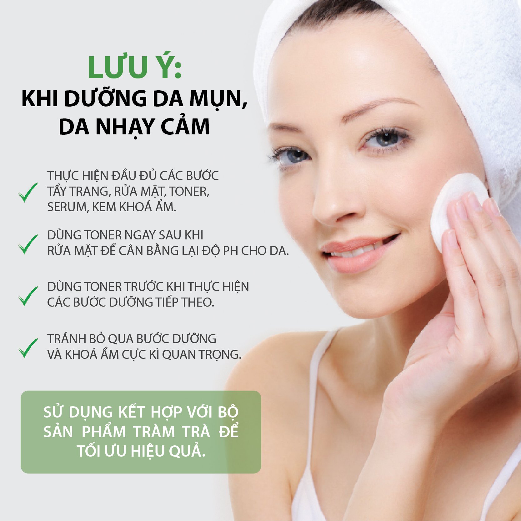 - Ngăn ngừa mụn: Thành phần tinh dầu Tràm Trà trong toner sẽ hạn chế tối đa các vi khuẩn mụn, ức chế viêm nhiễm từ đó làm teo các nốt mụn đỏ từ bên trong