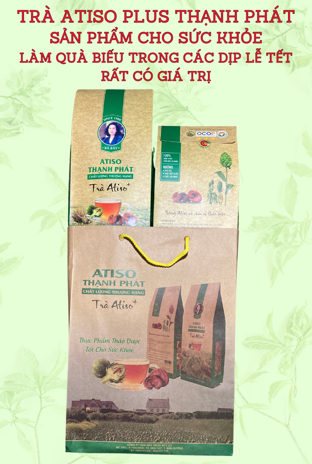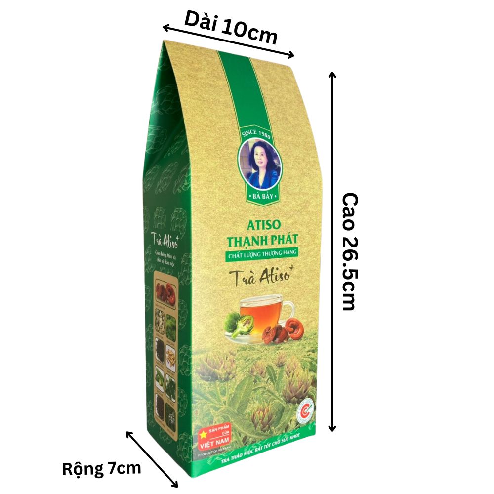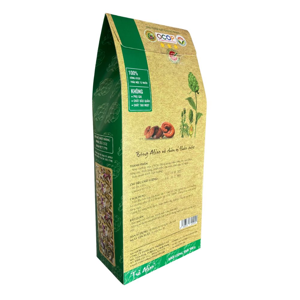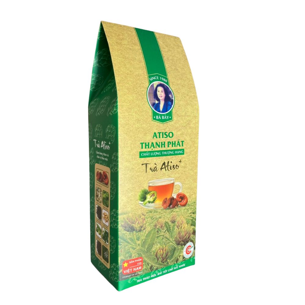 | Thành phần | ATISO và 9 VỊ THẢO MỘC:Bông Atiso (100% BÔNG ATISO nguyên chất)Nấm Linh ChiCam ThảoBông CúcĐinh LăngNhân TrầnRâu mèoKhổ quaCỏ NgọtThảo Quyết Minh (hạt muồng) |
