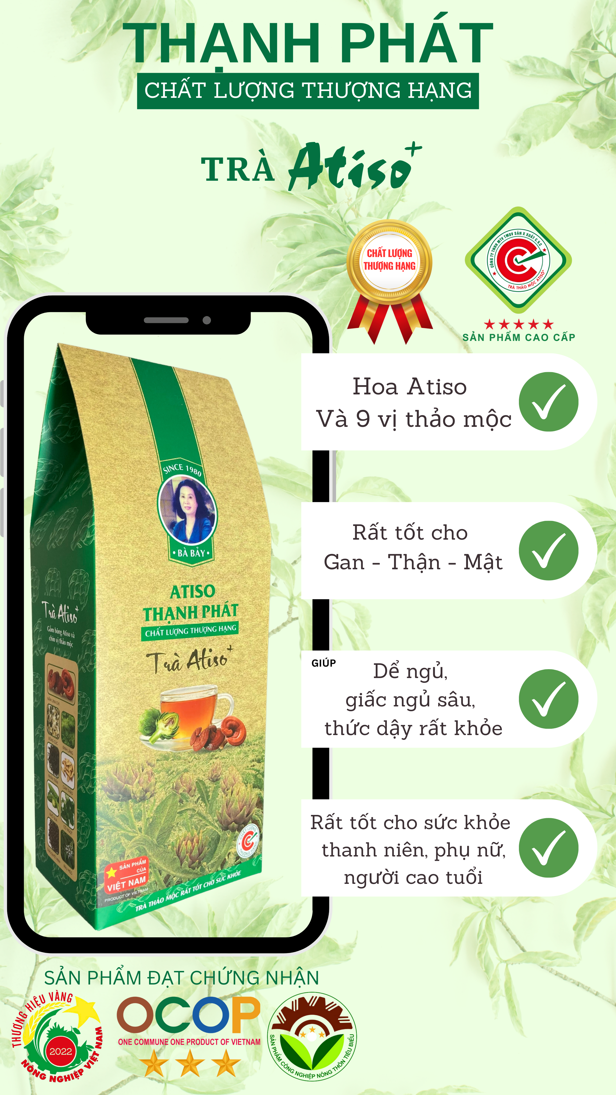 LÀ NHÃN HÀNG CAO CẤP VỚI SỰ KẾT HỢP ĐẶT BIỆT GIỮA BÔNG ATISO NGUYÊN CHẤT VÀ 9 VỊ THẢO MỘC, gồm: