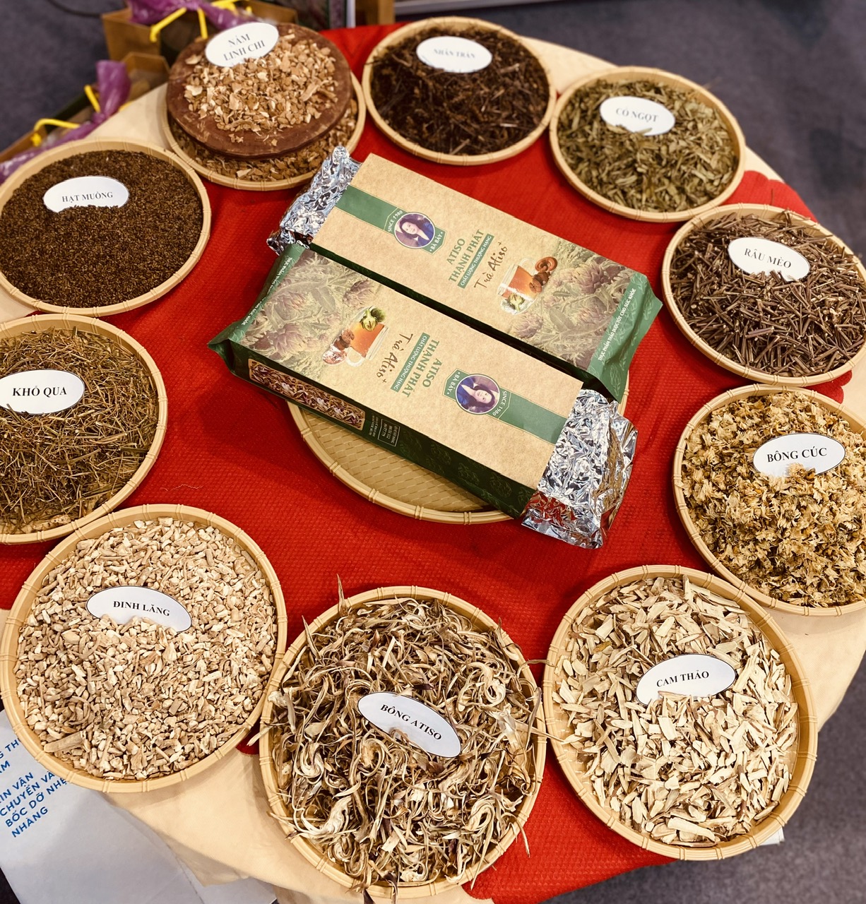 1. BÔNG ATISO NGUYÊN CHẤT 2. NẤM LINH CHI 3. CAM THẢO 4. BÔNG CÚC 5. ĐINH LĂNG 6. NHÂN TRẦN 7. RÂU MÈO 8. KHỔ QUA 9. CỎ NGỌT 10. THẢO QUYẾT MINH