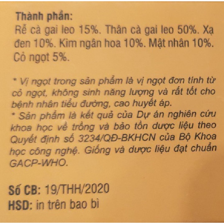 1. THÀNH PHẦN: - Rễ cà gai leo: 15% - Thân cà gai leo: 50% - Mật nhân: 10% - Xạ đen: 10% - Kim ngân hoa: 10% - Cỏ ngọt: 05% Vị ngọt trong sản phẩm là vị ngọt đơn tính từ cỏ ngọt, không sinh năng lượng và rất tốt cho bệnh nhân tiểu đường, cao huyết áp. Ngoài ra, Trà Cà gai leo thế hệ mới có bổ sung Mật nhân là thành phần có tác dụng chống lại khí hư huyết kém, ăn không tiêu, suy nhược, tiêu hóa kém. Đặc biệt giúp tăng cường sức khỏe sinh lý ở nam giới. 2.. CÔNG DỤNG: Cà gai leo có hàm lượng lớn các chất như ancaloit, glycoancaloit... có khả năng bảo vệ tế bào gan rất tốt, kìm hãm và làm âm tính vi rút viêm gan; ngăn chặn quá trình xơ gan, dùng chữa các bệnh liên quan đến gan. - Tăng cường chức năng gan, hạ men gan, mỡ máu - Hỗ trợ chữa xơ gan, bệnh viêm gan B, kìm hãm sự phát triển của vius viêm gan B - Làm giảm các các triệu chứng của bệnh gan như: Đau tức hạ sườn phải, vàng da … - Giải độc gan như: Mụn nhọt, dị ứng nổi mề đay. - Chữa phong thấp, đau nhức răng, chảy máu chân răng, - Giải rượu. 3. CÁCH DÙNG Ngâm túi trà vào trong nước sôi (100oC), sử dụng sau 3-5 phút. Có thể thêm đá nếu thích. Mỗi ngày nên dùng 2-3 túi lọc. Để thu được đầy đủ hoạt chất tốt nên cho vào đun sôi hoặc pha trong bình thủy. 4. Bảo quản Sản phẩm này không sử dụng chất bảo quản, nên để nơi khô ráo, dưới 30oC, tránh ánh nắng trực tiếp Cảnh báo an toàn: Không sử dụng khi bao bì không nguyên vẹn. 5. Hạn sử dụng - 24 tháng kể từ ngày sản xuất (In trên bao bì) - Khối lượng tịnh: 75 g. 6. Số CB: 07/THH/2019