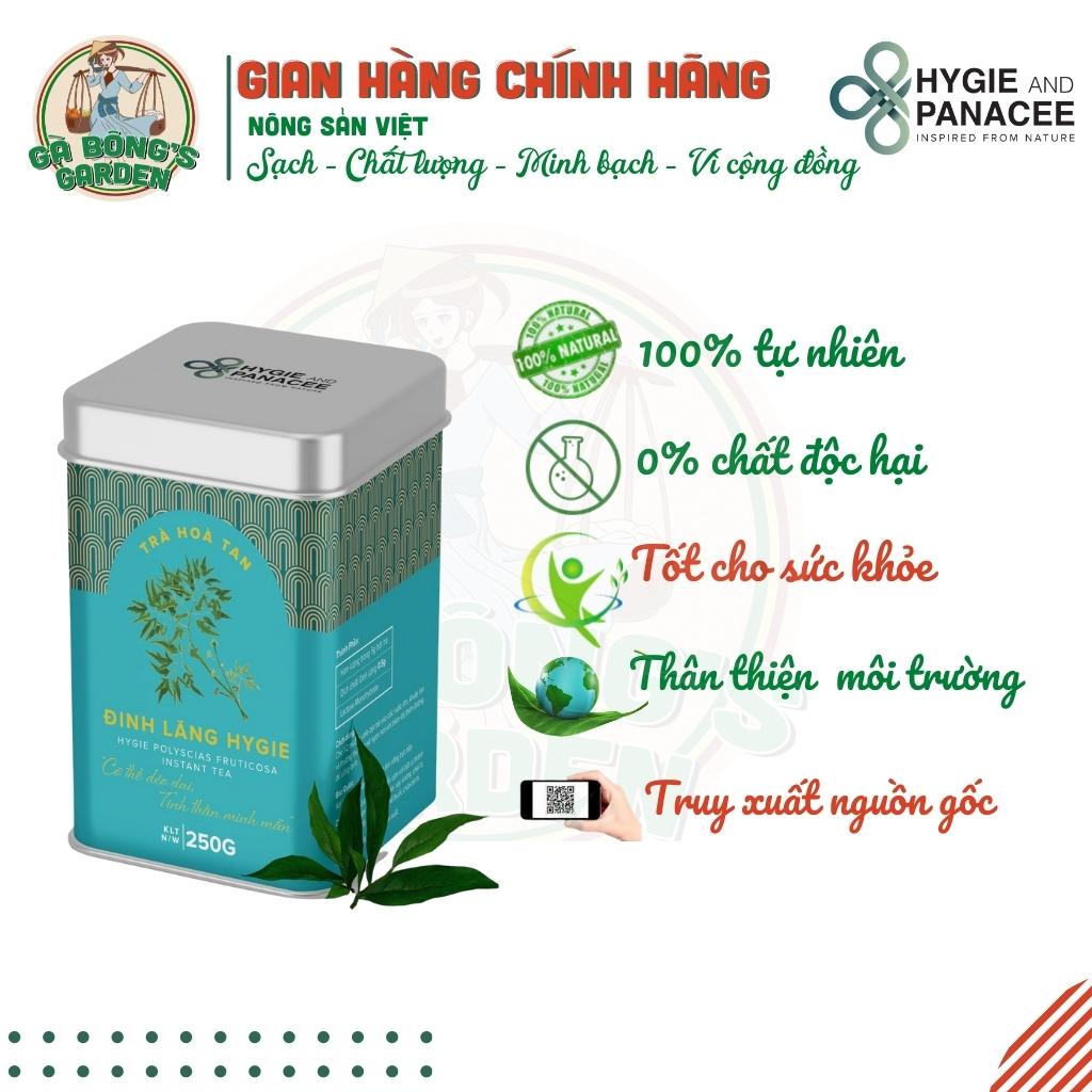 TRÀ ĐINH LĂNG HOÀ TAN Gà bông's Garden- Kênh phân phối chính hãng các sản phẩm Hygie&Panacee. Shop lựa chọn sản phẩm nông sản Việt chất lượng, an toàn để đồng hành cùng bà con nông dân và thương hiệu Việt. Cảm ơn bạn vì đã góp phần giải quyết đầu ra cho nông sản Việt, đã tin yêu và sử dụng sản phẩm Việt. Vì một tương lai nông sản Việt bay xa! -------------------------------------- 1. Tên sản phẩm: TRÀ ĐINH LĂNG HÒA TAN - Khối lượng: Hộp trụ 250g - Hạn sử dụng: 18 tháng - Ngày sản xuất: in trên bao bì - Ngày hết hạn: xem trên bao bì - Xuất xứ: Việt Nam - Sản xuất tại: Công ty TNHH MTV Hygie & Panacee - Địa chỉ: 65-67B30,KDC 91B, Phường An Khánh, Quận Ninh Kiều, Thành Phố Cần Thợ, Việt Nam