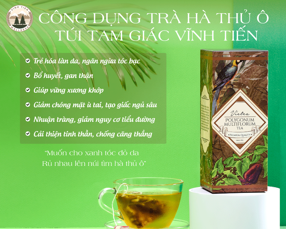 Trà hà thủ ô với nền tảng chính là tinh phẩm hà thủ ô được thu hoạch từ vùng núi trung du miền cao giữ trọn được độ tinh khiết tự nhiên. Vị hơi nhẫn của hà thủ ô kết hợp cùng vị ngọt của cam thảo đã tạo nên hương vị riêng của trà hà thủ ô Vĩnh Tiến. Nước trà có màu vàng nâu, hương thơm dịu nhẹ tạo cảm giác thư thái khi thưởng trà, mà còn có tác dụng bổ huyết, tăng cường hệ miễn dịch, chống lão hóa sớm để lưu giữ vẻ thanh xuân.
