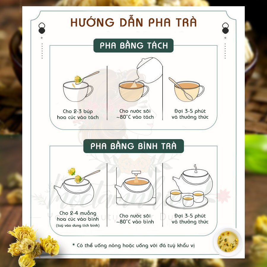 Cho 2-4 búp vào ly hoặc 2-4 muỗng hoa cúc vào bình. Đợi 3-5 phút và thưởng thức (có thể uống nóng hoặc lạnh tuỳ sở thích)