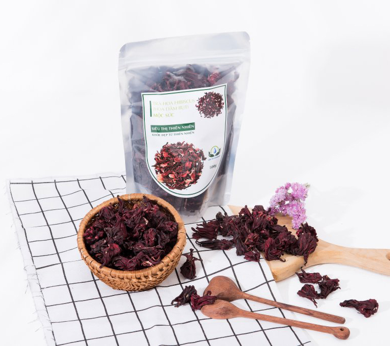 --------------------------------------Trà Hibicus hay còn gọi là Trà Hoa Dâm Bụt là một trong những loại trà được yêu thích nhất hiện nay bởi những tác dụng tuyệt với mà nó mang lại. Hãy cùng tìm hiểu về công dụng của loài hoa này nhé!--------------------------------------Công dụng của Trà hoa Hibiscus – Trà hoa dâm bụt- Chống lại các gốc tự do và tác nhân gây bệnh thông thường.- Hạ huyết áp: Theo một nghiên cứu của một trường Đại học ở Mỹ, việc uống trà Hibiscus mỗi ngày giúp hạ huyết áp. Cũng có thể tăng cường sức khỏe tim mạch cho người có nguy cơ bị huyết áp cao.- Tăng cường miễn dịch: Lượng vitamin C phong phú giúp chống lại chứng cảm lạnh và nhiễm trùng.- Giảm cân: Trà có chứa chất ức chế enzyme giúp sản xuất amylase có tác động tích cực đến quá trình giảm cân.- Ngăn ngừa nhiễm trùng bàng quang và táo bón.--------------------------------------Trà hoa Hibiscus – Trà hoa dâm bụt Mộc Sắc được làm như thế nào?- Nguyên liệu chính: 100% hoa Hibicus được chọn lọc và sấy khô tự nhiên, đảm bảo an toàn, hiệu quả, đáp ứng đầy đủ tiêu chuẩn vệ sinh an toàn thực phẩm của Bộ Y tế. Hoa dâm bụt sau khi sấy vẫn giữ nguyên màu sắc và mùi vị.Không sử dụng hóa chất bảo quản, an toàn cho sức khỏe.--------------------------------------Cách dùng Trà Hoa Hibiscus- Cách pha+ Chuẩn bị: Một lượng hoa khô vừa dùng, nước đun sôi+ Cách pha: Bạn cho hoa Hibiscus khô vào nước nóng ngâm khoảng 10-20 phút rồi thưởng thức.Trà này có vị chua chua cay cay nhè nhẹ nên bạn cũng có thể sử dụng với những thực phẩm ngọt ngọt để tăng thêm sức hấp dẫn của trà nhé.- Liều lượng+ Đối với hạ huyết áp: 3 cốc (3x240ml) mỗi ngày sẽ giúp bạn giảm 7,2mmHg áp suất tâm thu và 3,1mmHg áp suất tâm trương.+ Đối với việc giảm cân: 1 cốc sau bữa ăn sẽ làm giảm hấp thu carbohydrate và giúp giảm cân.--------------------------------------Bảo quản nơi khô ráo thoáng mát, buộc chặt miệng túi sau khi dùng.Hạn sử dụng 12 tháng kể từ ngày sản xuấtXuất xứ tại: Siêu thị thiên nhiên - Hà Nội - Việt Nam.Sản phẩm có đầy đủ mã vạch để quý khách kiểm tra.Sản phẩm này không phải là thuốc và không có tác dụng thay thế thuốc chữa bệnh.Bao bì, mẫu mã thay đổi theo đợt