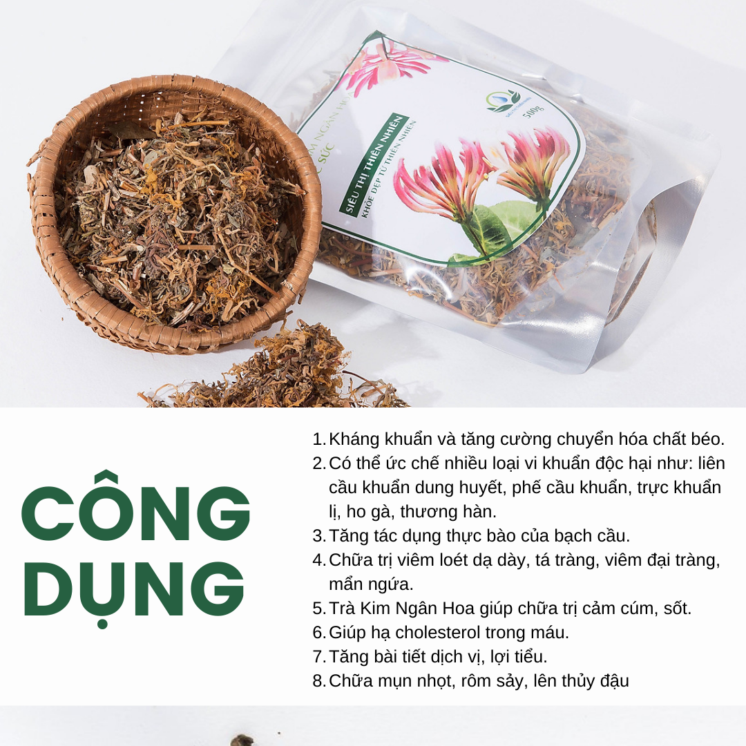 Trà Kim Ngân Hoa được làm từ một loài hoa đặc biệt với hai màu trắng và vàng tương ứng với buổi sáng và tối. Loài hoa này được coi là một dược liệu quan trọng trong quá trình bằng liệu pháp Đông y. Đây còn là một loại thảo dược chuyên dụng để kháng khuẩn và tăng cường chuyển hóa chất béo.