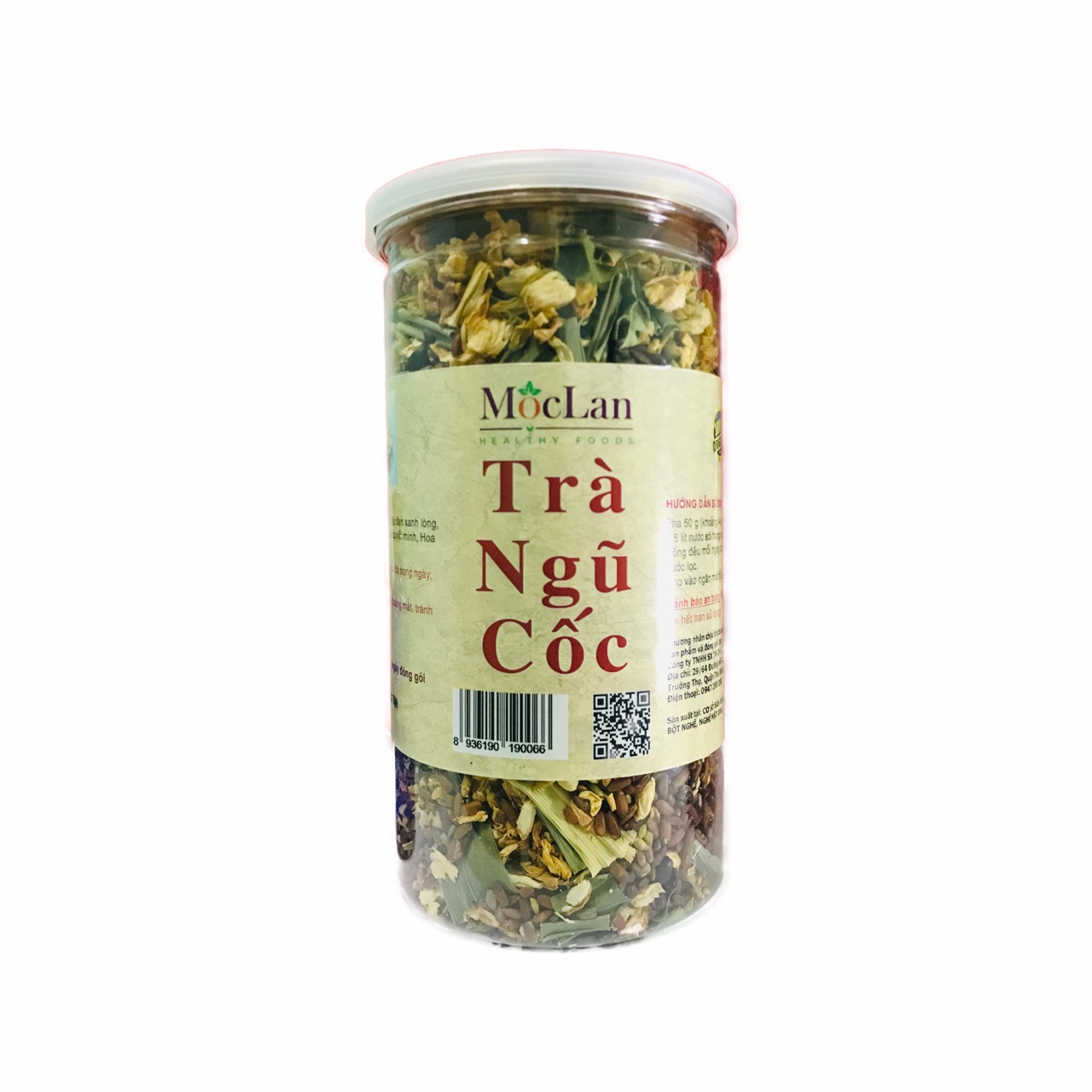 Trà Ngũ Cốc với thành phần gạo lứt huyết rồng ,đậu đen xanh lòng, đậu đỏ, đậu xanh, thảo quyết minh ,hoa hoè, hoa lài, lá dứa.