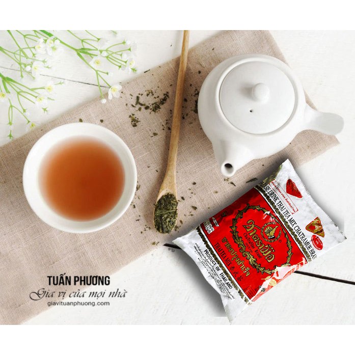 🔴 Trà Thái hay còn gọi là Trà Thái Lan là một loại trà để pha trà sữa, mùi thơm thoang thoảng , nhẹ nhàng. Không chỉ có vị thơm dịu của bột trà, lá trà mà còn là gia vị đặc trưng của người thái. 🔴 Những lưu ý khi dùng trà thái : – Do trà thái có nguyên liệu từ trà pha ủ thật đặc nên phụ nữ đang mang thai và đang cho con bú không nên uống quá nhiều. 🔴 Phân loại : – Gồm hai loại + Bột Trà Thái Xanh + Bột Trà Thái Đỏ 🔴 Hướng dẫn sử dụng : 👉 Pha 40g trà với 2 lít nước sôi, để 20 phút cho trà ngấm rồi lọc lấy nước cốt. Phần bã trà đem vò thêm một chút rồi cho tiếp 1,5 lít nước nguội vào lọc lại lần nữa rồi hoà vào nồi nước cốt trà sẽ được một hỗn hợp trà có màu xanh đen đậm đặc. Cho sữa bột và đường cát vào nước trà hoà tan, trà sẽ chuyển sang màu xanh cốm, thêm đá và thưởng thức. ✅ Bảo quản : Bảo quản nơi khô ráo thoáng mát.