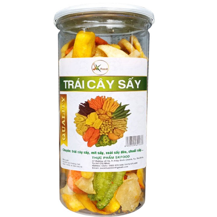 Xuất xứ : Việt Nam. Ngày sản xuất: In trên bao bì Hạn sử dụng: 12 tháng kể từ ngày sản xuất Trọng lượng: In trên bao bì Thương Hiệu SK FOOD Sản phẩm có giấy chứng nhận an toàn vệ sinh thực phẩm. Hướng dẫn sử dụng: Dùng trực tiếp, không cần chế biến. Hướng dẫn bảo quản: Nơi khô ráo thoáng mát, tránh ánh nắng mặt trời. Dùng không hết có thể đóng kín miệng nắp để dùng lần sau. Không sử dụng sản phẩm đã hết hạn. _____________________ TRÁI CÂY SẤY KHÔ 1. Tăng cường miễn dịch và giúp chống lại bệnh tật Trái cây sấy khô được biết đến với rất nhiều chất dinh dưỡng thiết yếu có lợi cho sức khỏe bạn không thể bỏ qua. Trái cây sấy khô làm tăng lượng chất dinh dưỡng của bạn vì chúng rất giàu kali, sắt, magie và canxi. Các chất chống oxy hóa tăng cường khả năng miễn dịch của bạn. Giữ cho bạn khỏe mạnh và không mắc các bệnh khác. Phòng chống bệnh tật là một trong những lợi ích tuyệt vời mà hoa quả sấy khô mang lại cho bạn. 2. Giúp chống ung thư Những hợp chất có sẵn trong các loại hoa quả tươi còn giữ lại nguyên vẹn chất dinh dưỡng trong quá trình sấy. Vì vậy, chúng rất giàu chất chống oxy hóa, ngăn chặn sự phát triển của các tế bào ung thư tồn tại, sinh sôi trong cơ thể con người. Những loại bệnh ung thư mà hoa quả khô có thể phòng chống được như: ung thư vú, ung thư phổi, ung thư tuyến tiền liệt… 3. Giúp giảm cân Những người sử dụng trái cây khô trong chế độ ăn uống của họ nhận thức rõ về lợi ích của trái cây khô để giảm cân. Khi tiêu thụ ở mức độ vừa phải, chúng giúp bạn giảm cân và giữ dáng. Trái cây khô được biết là có ít chất béo. Ít đường và các chất dinh dưỡng cần thiết hơn để trao đổi chất thích hợp. Giảm cân là một trong những lợi ích tuyệt vời mà hoa quả sấy khô mang lại cho chúng ta. 4. Chống táo bón Trái cây khô có nhiều lợi ích vì chúng giàu chất xơ đảm bảo ruột khỏe mạnh. Chất xơ giúp cơ thể loại bỏ chất thải ra khỏi cơ thể một cách trơn tru. Trái cây khô xơ khác làm cho ruột của bạn linh hoạt hơn và do đó, làm giảm táo bón. 5. Giữ cho bụng của bạn khỏe mạnh Các loại trái cây sấy khô khác có chất xơ, cả hòa tan và không hòa tan, giúp cải thiện tiêu hóa và giữ cho dạ dày và ruột của bạn khỏe mạnh. Các sợi hòa tan hoạt động như một chế phẩm sinh học và duy trì các vi khuẩn tốt cần thiết. 6. Có đặc tính chống lão hóa và thân thiện với da Nếu trái cây khô có thể làm việc kỳ diệu, thì việc đưa chúng vào chế độ ăn uống của bạn có hợp lý không? Làn da rạng rỡ, tươi sáng, ngừa lão hóa là một số lợi ích mà trái cây khô mang lại cho làn da của bạn.