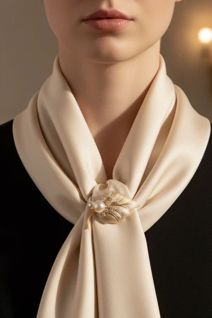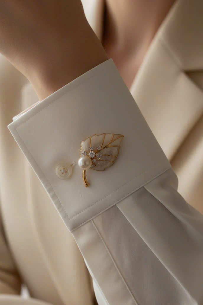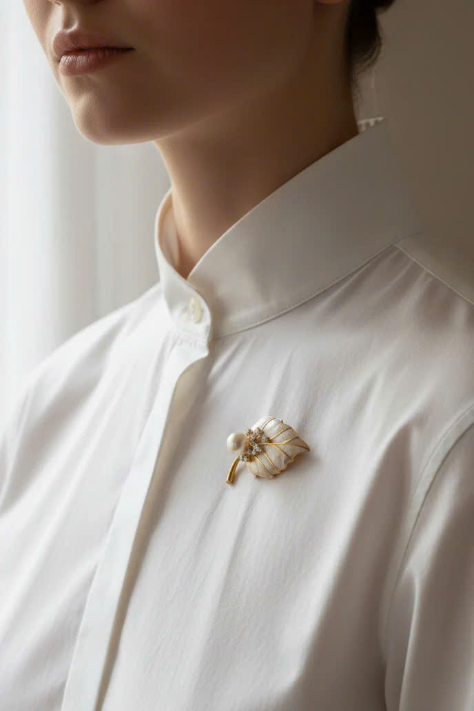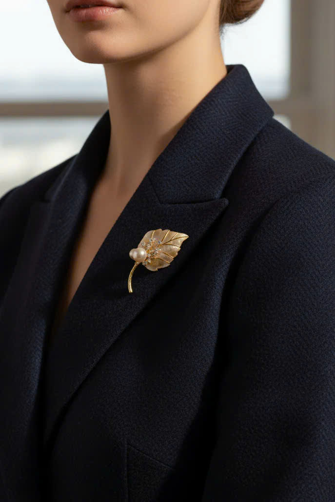 Chiếc cài áo không chỉ là một món trang sức, mà còn là điểm nhấn thể hiện gu thẩm mỹ tinh tế của người phụ nữ. Cài áo hình chiếc lá được chế tác thủ công tinh xảo, mang đến vẻ đẹp vừa cổ điển vừa hiện đại.
