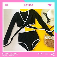 freeship Bikini đồ bơi tay dài đắp chéo quần cạp cao viền trắng cột dây ngực sành điệu VATIXA BKN04