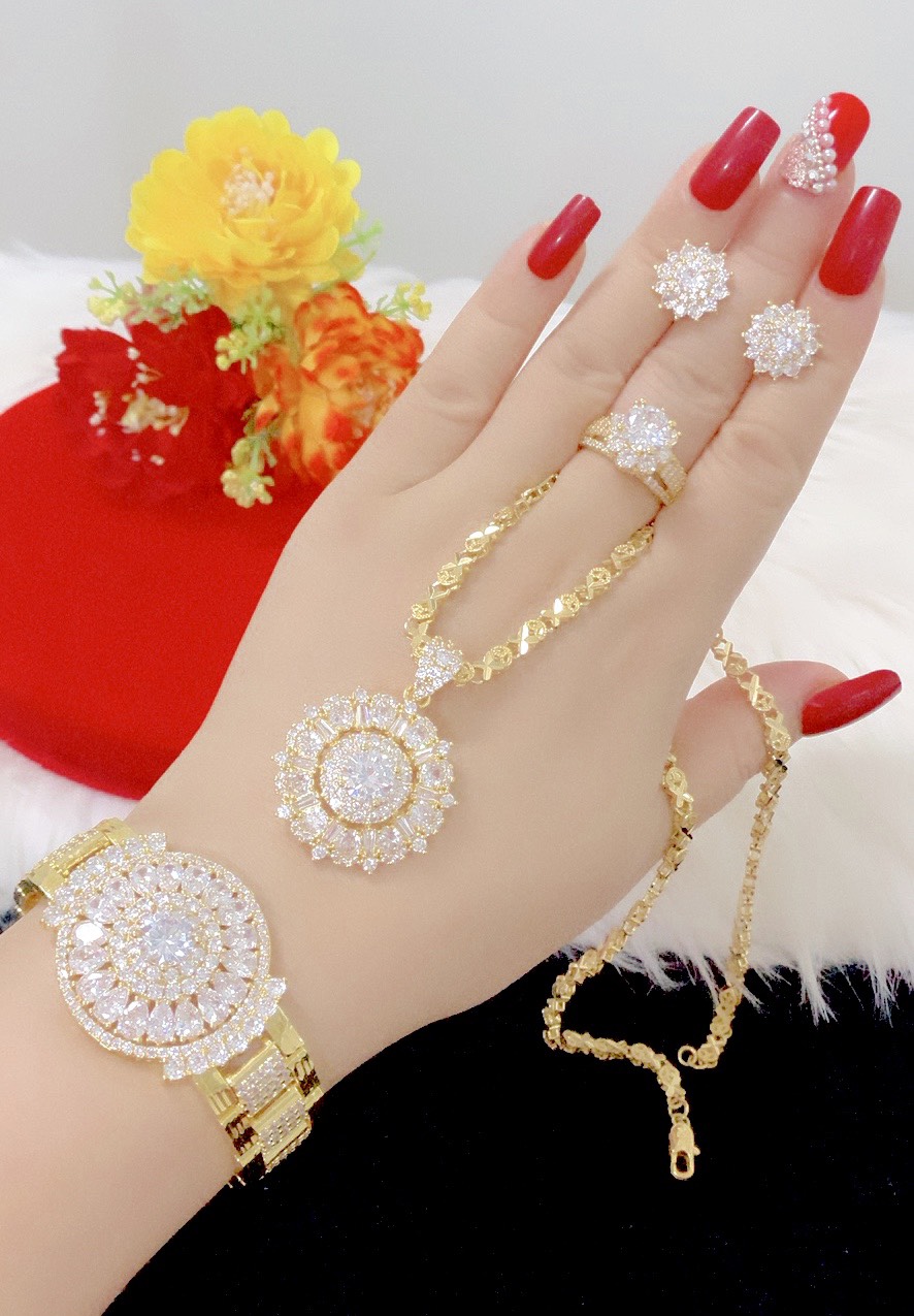 --- Bộ trang sức 4 món được làm từ Chất liệu hợp kim cao cấp phủ 4 lớp xi màu 18 .k cao cấp với công nghệ tiến tiến nhất của hàn quốc ,giúp sản phẩm luôn sáng và bền màu giống thật đến 99.99%---Ko phân biệt được bằng mắt thường---Xi 4 lớp chống ngứa ko gây ảnh hưởng đến da---thiết kế tinh xảo ,sắc nét đến từng chi tiết giúp bạn thêm tỏa sáng---Kiểu dáng thời thượng thích hợp mọi loại trang phụ---thích hợp cho những buổi sang trọng hoặc đi chơi,đi làm---đeo ko dị ứng ,ko ngứa---Trang sức cao cấp đang là xu hướng lựa chọn cho phụ nữ thông minh*LƯU Ý *HƯỚNG DẪN SỬ DỤNG---để sản phẩm có độ bền màu cao quý khách vui lòng--- ko xịt nước hoa lên bề mặt sản phẩm---ko ngâm trang sức trong dung dịch tẩy rửa quá lâu---lau kĩ sản phẩm bằng khăn mềm khi đã sử dụng để loại bỏ lớp mồi hôi---cất ngay sản phẩm vào hộp để tránh ko khí*LƯU Ý **SIZE NHẪN NỮ+đường kính lòng nhẫn 15mm (phù hợp cân nặng 38kg--45 kg ) thì chọn size 5+đường kính lòng nhẫn 16mm( phù hợp cân nặng 45kg -- 54kg )thì chọn size 6+đường kính lòng nhẫn 17mm( phù hợp cân nặng 54kg --60kg ) thì chọn size 7+đường kính lòng nhẫn 18mm(phù hợp cân nặng 60kg --65kg) thì chọn size 8NI VÒNG TAY + LẮC TAY NỮđo sát cổ tay 15cm (ni 48) chọn size 15cm (38kg--45kg)đo sát cổ tay 16cm (ni 50) chọn size 16cm (45kg --50kg)đo sát cổ tay 17cm (ni 52) chọn size 17cm ( 55kg-- 60kg)đo sát cổ tay 18cm (ni 54) chọn size 18cm (60kg --65kg)đo sát cổ tay 19cm (ni 54) chọn size 19cm (65kg--75kg)