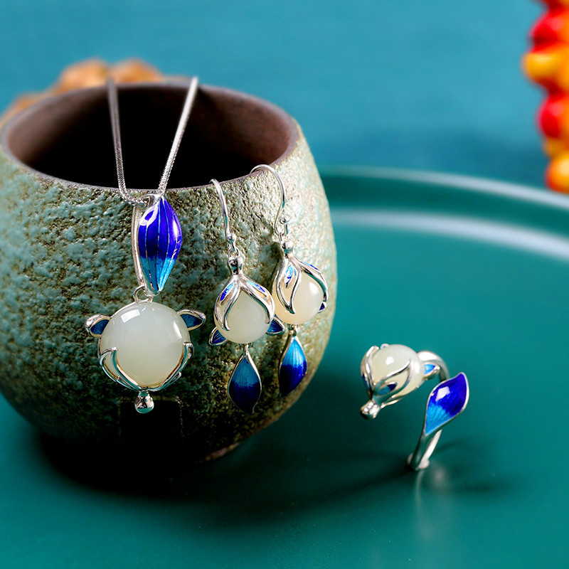 Kích thước: Bông tai dài 4.3cm, rộng 1.3cm; vòng cổ dây dài 60cm, mawjtj rộng 2.0cm, dài 3.9cm; nhẫn free size